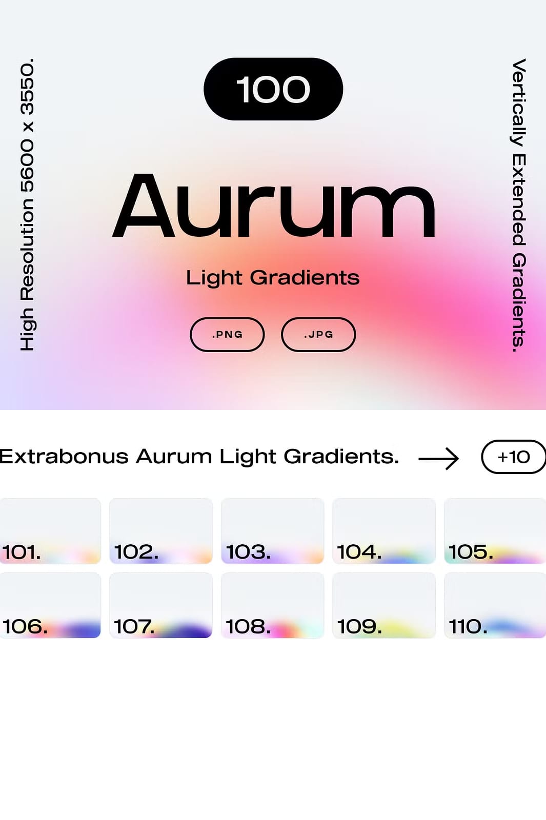 With this collection, you receive 110 PNG and 110 JPG files, both incorporating 10 additional bonus gradients for even more creative freedom. Every gradient is vertically extended to provide flexible use across diverse formats and dimensions. All files come in super high-resolution dimensions of 5600 by 3550 pixels at an exceptional 1000 DPI, ensuring your outputs are sharp and vibrant regardless of size. Additionally, a noise/grain texture template is included in .PSD format, enabling you to add subtle texture overlays or tweak designs for a refined artistic touch.