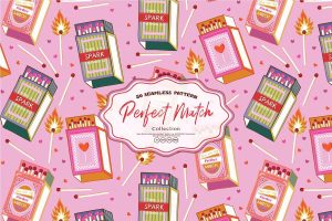 Bring Romance and Playfulness to Your Designs Ignite the spirit of love and celebration with the Perfect Match Collection, a lively and romantic set of seamless Valentine’s Day patterns. This collection features charming matchboxes emblazoned with “Perfect Match,” interlocking jigsaw pieces symbolizing connection, elegant swans forming heart shapes, and a variety of love-inspired motifs such as red and pink bows, cherries, bubble tea, and lattes adorned with heart art. The design bursts with playful energy and vibrant tones of red, ...
