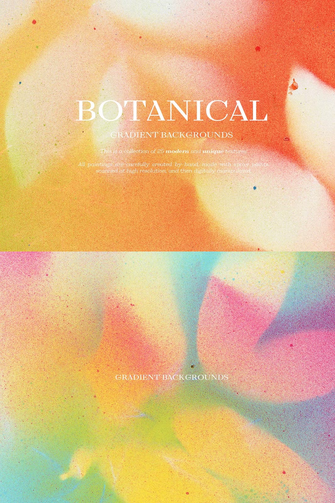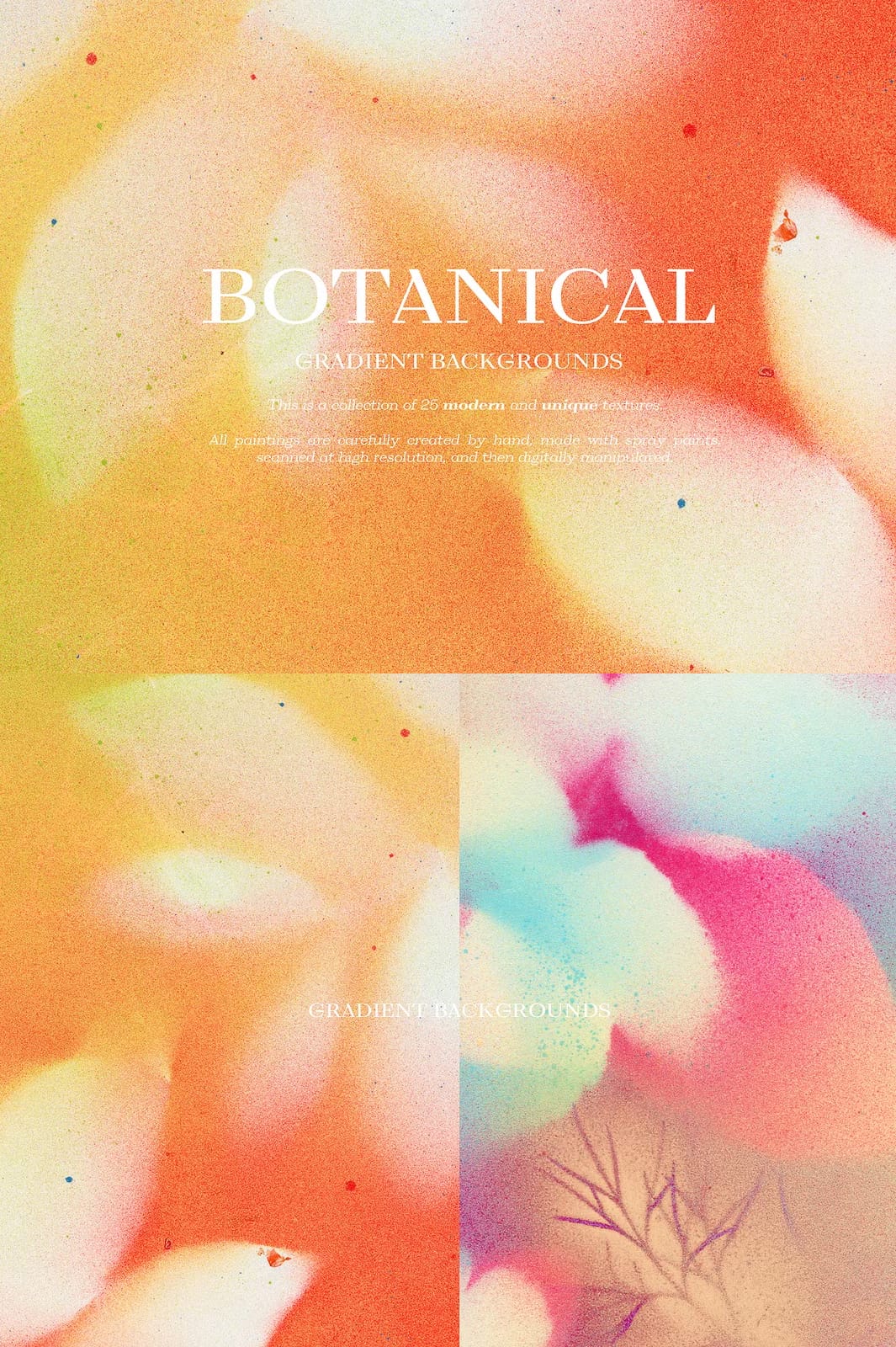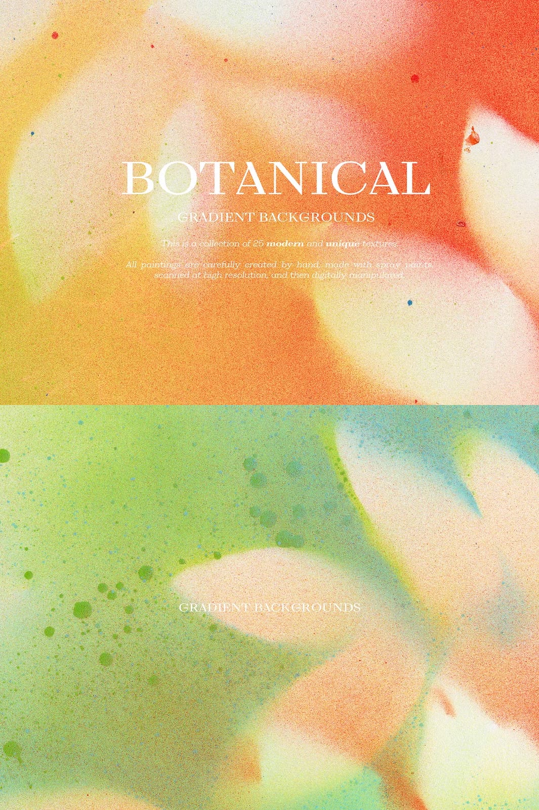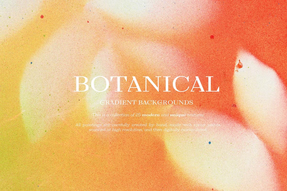 Enhance your creative projects with the remarkable Botanical Gradient Textures collection, featuring 25 meticulously hand-painted and digitally refined designs. Each texture is crafted with precision using spray paints, then scanned at high resolution and expertly manipulated to produce vivid gradients that infuse your work with organic elegance and modern flair. This versatile collection is perfect for a broad range of applications, from blogs and social media branding to invitations, planner stickers, logos, posters, postcards, notebooks, wall art, bags, business cards, and countless other creative endeavors.