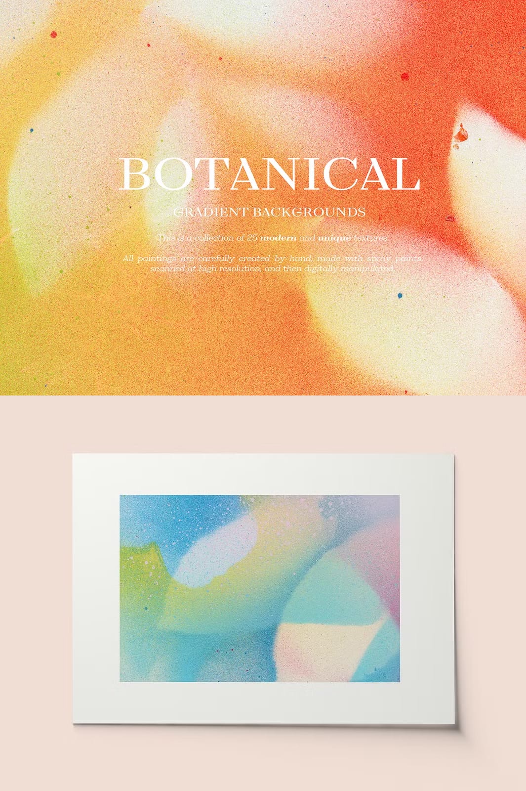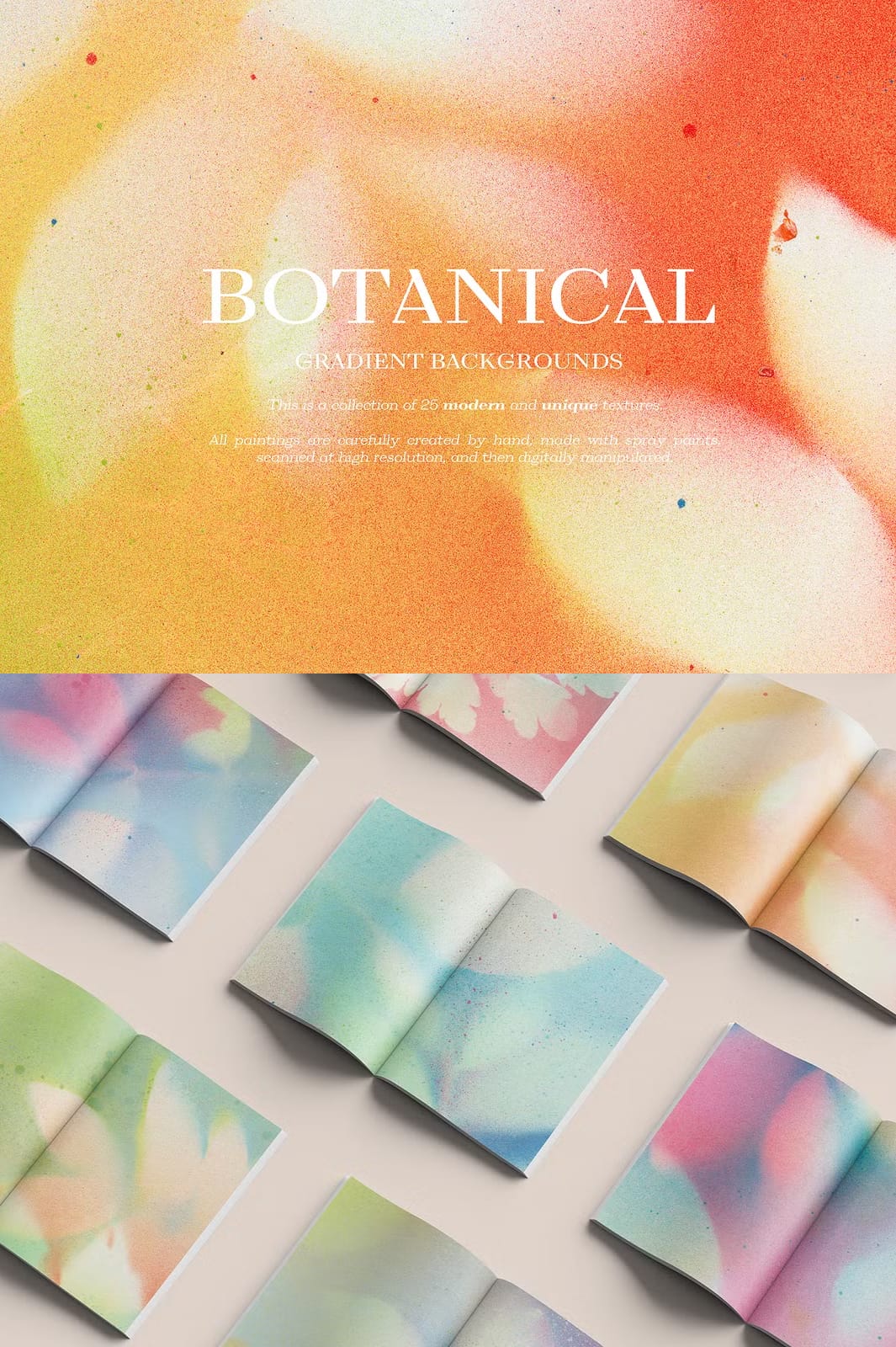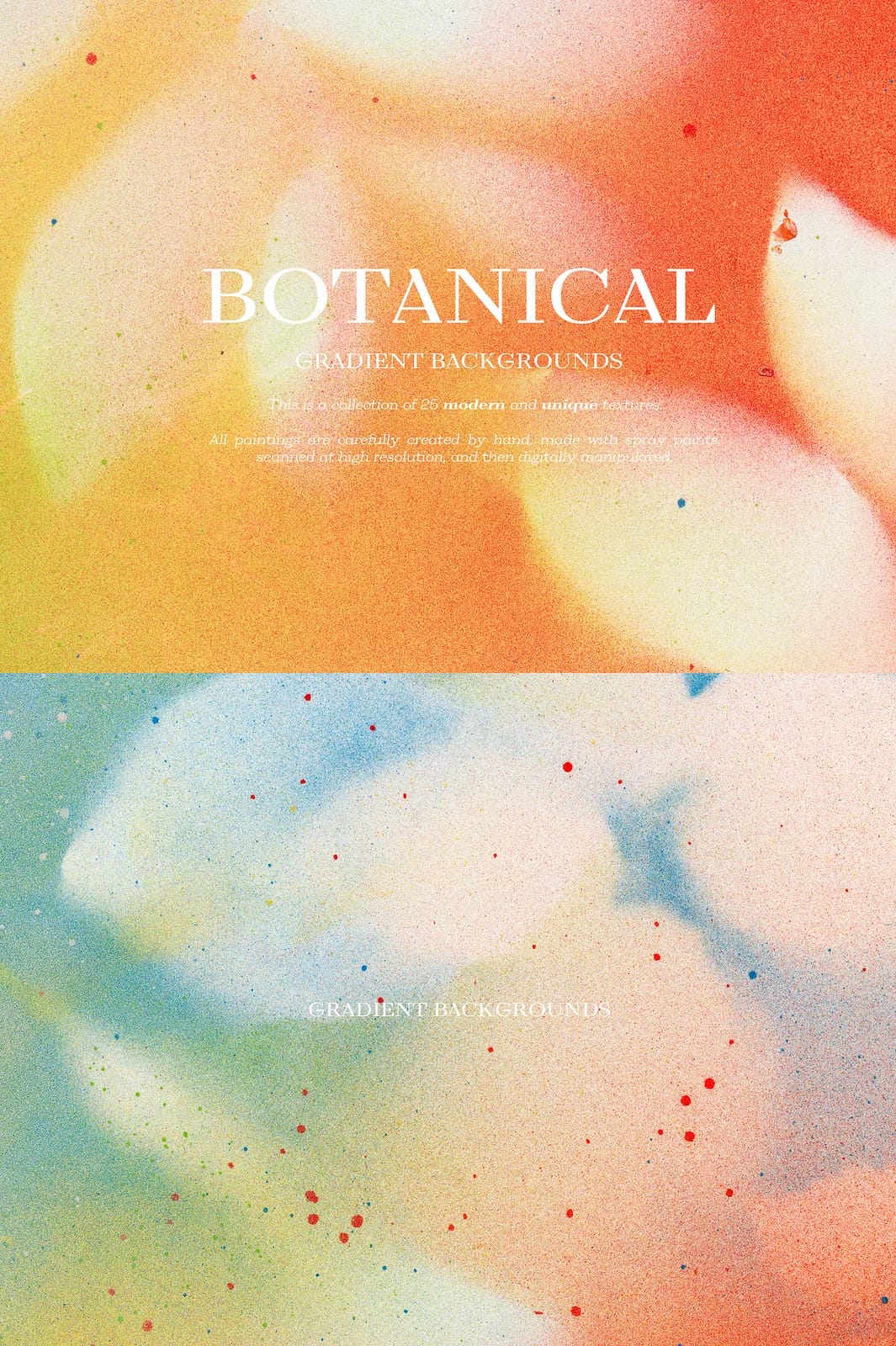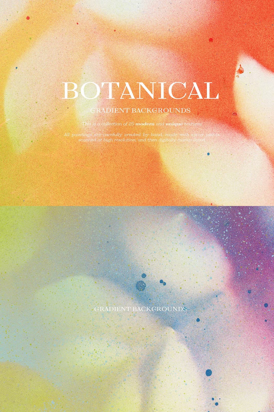 Enhance your creative projects with the remarkable Botanical Gradient Textures collection, featuring 25 meticulously hand-painted and digitally refined designs. Each texture is crafted with precision using spray paints, then scanned at high resolution and expertly manipulated to produce vivid gradients that infuse your work with organic elegance and modern flair. This versatile collection is perfect for a broad range of applications, from blogs and social media branding to invitations, planner stickers, logos, posters, postcards, notebooks, wall art, bags, business cards, and countless other creative endeavors.