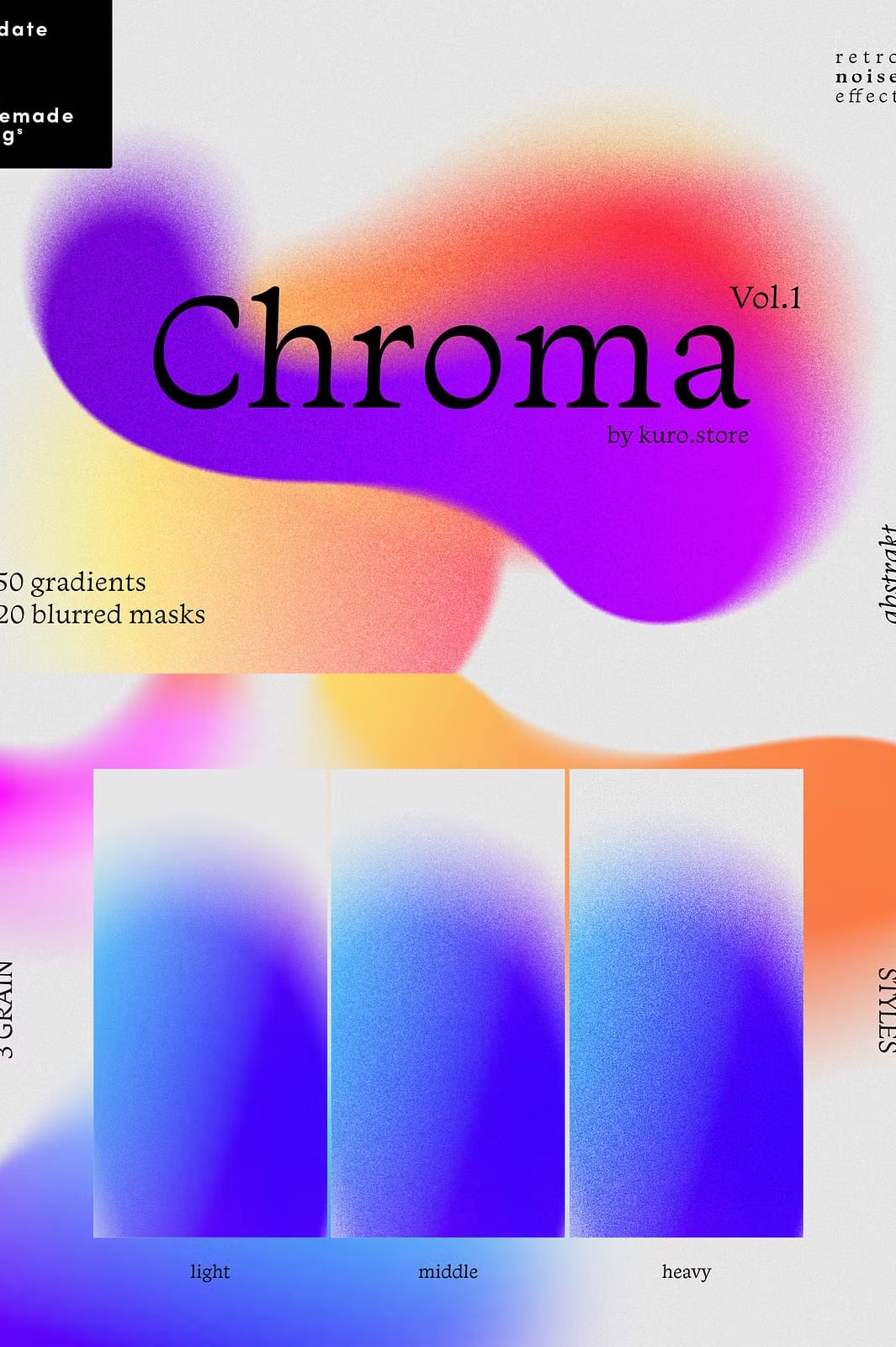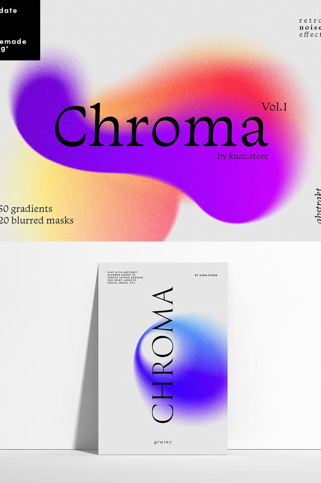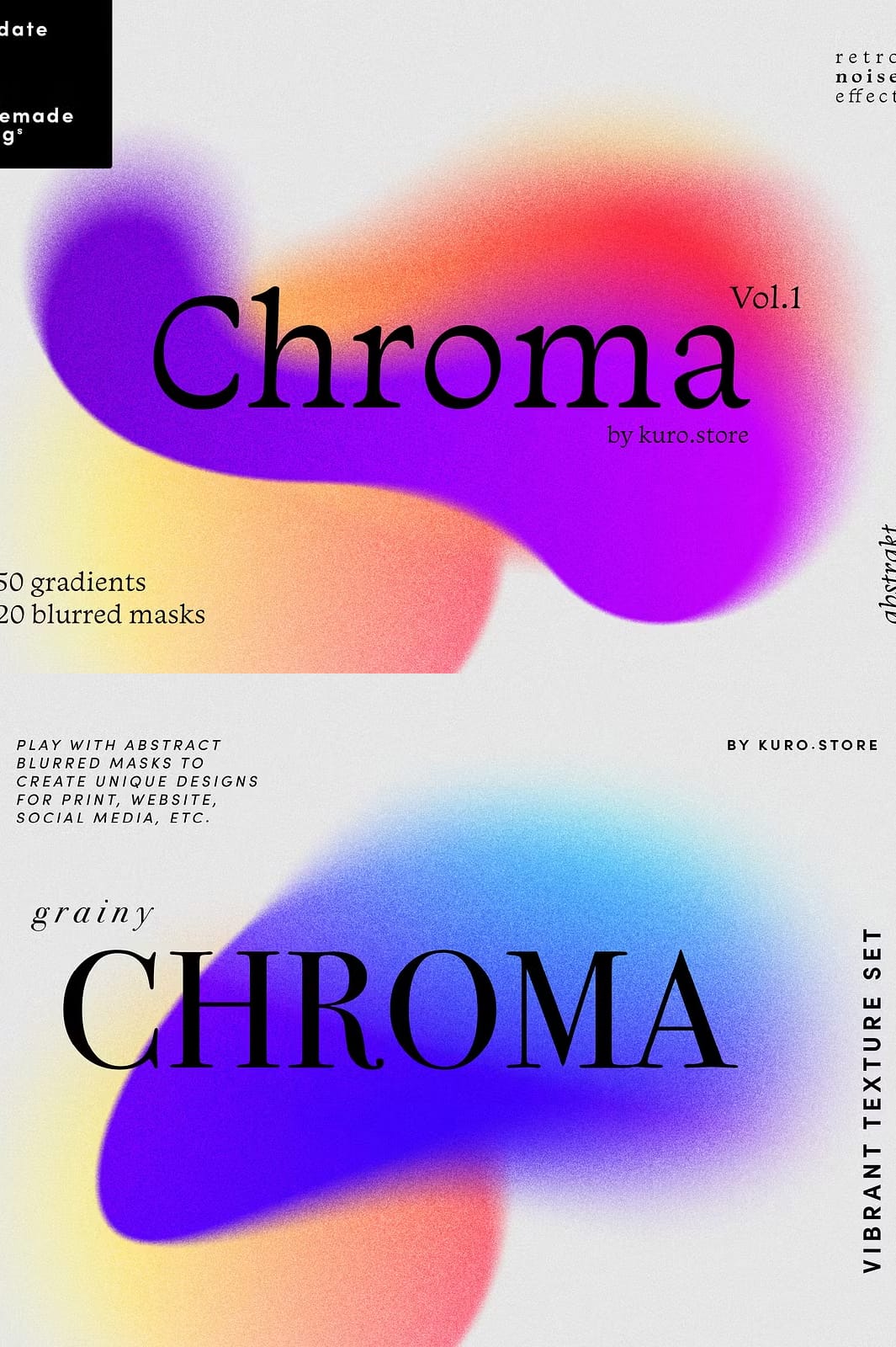 Elevate your creative projects with the Chroma Grainy Gradient Textures collection, a vibrant set of design assets that combine bold gradients, abstract shapes, and a retro-inspired grainy texture overlay. This collection is crafted to add energy and depth to your work, making it ideal for a wide range of applications including websites, brochures, posters, and social media content.