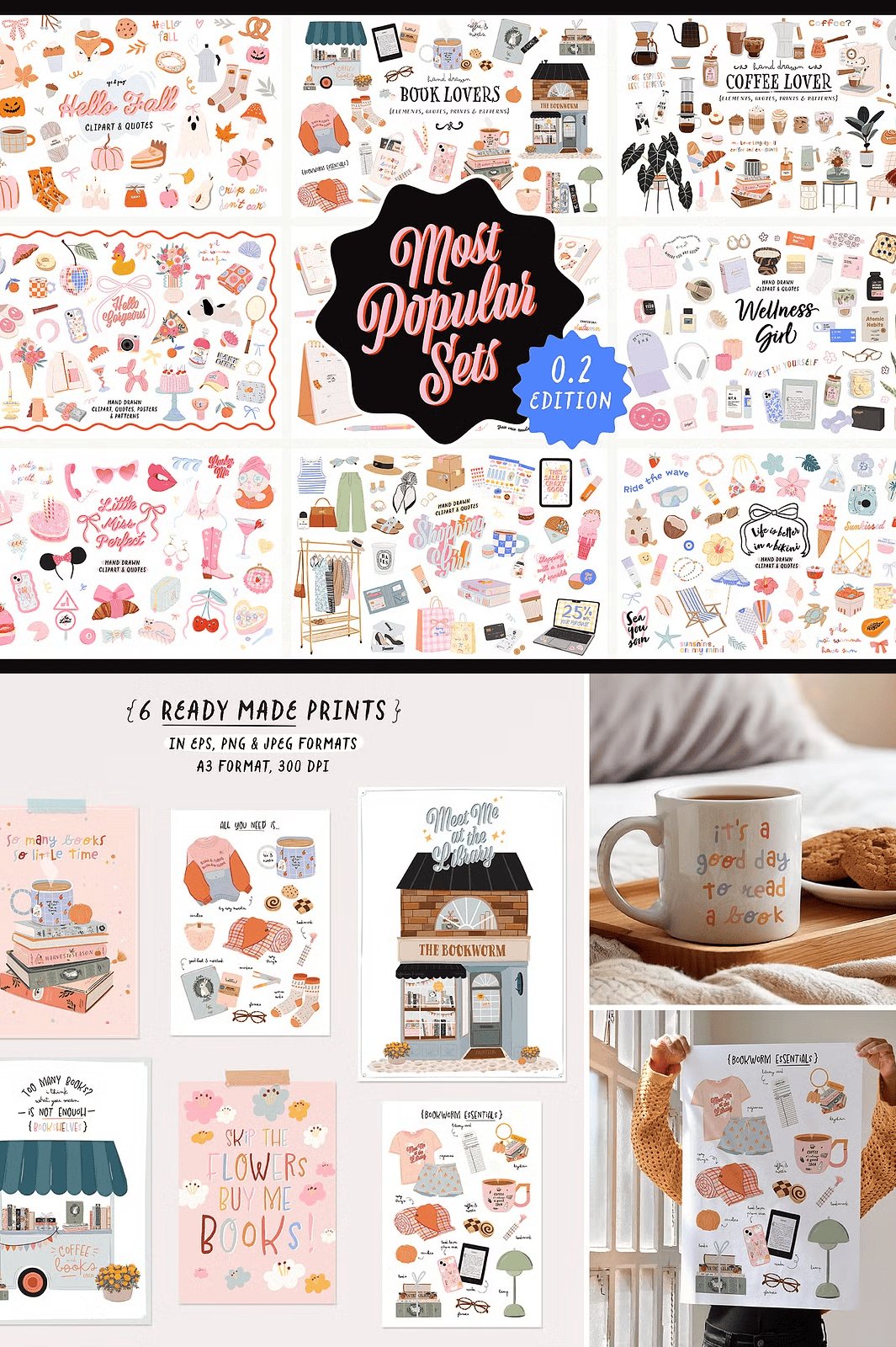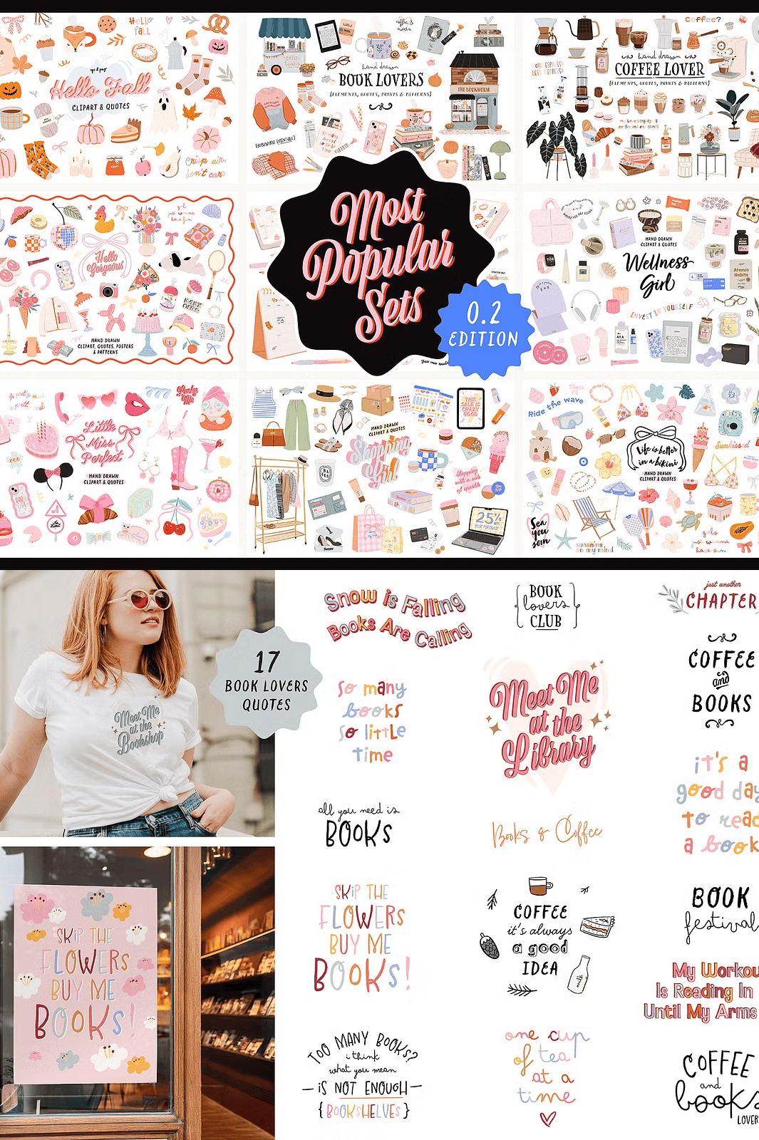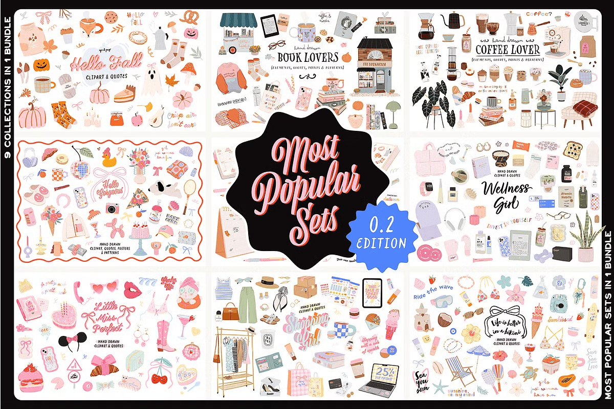 Unleash the full potential of your design projects with the Most Popular Sets Bundle — a thoughtfully curated collection of **9 award-winning, best-selling girly lifestyle clipart sets**. Designed for passionate creators, journalers, planners, digital artists, and social media maven, this bundle merges delicate hand-drawing styles with trendy, timeless aesthetics. Whether you’re crafting cozy fall vibes, dreamy bookish scenes, or vibrant summer escapades, this collection delivers instant inspiration and professional-grade elements — all in one seamless download.