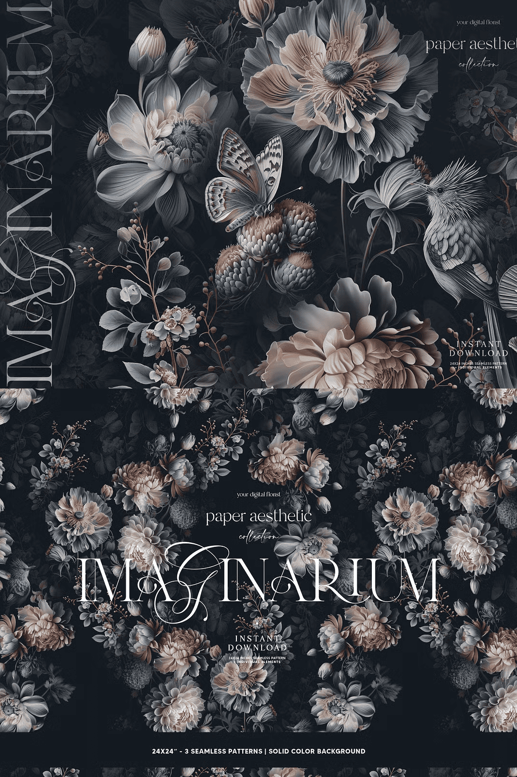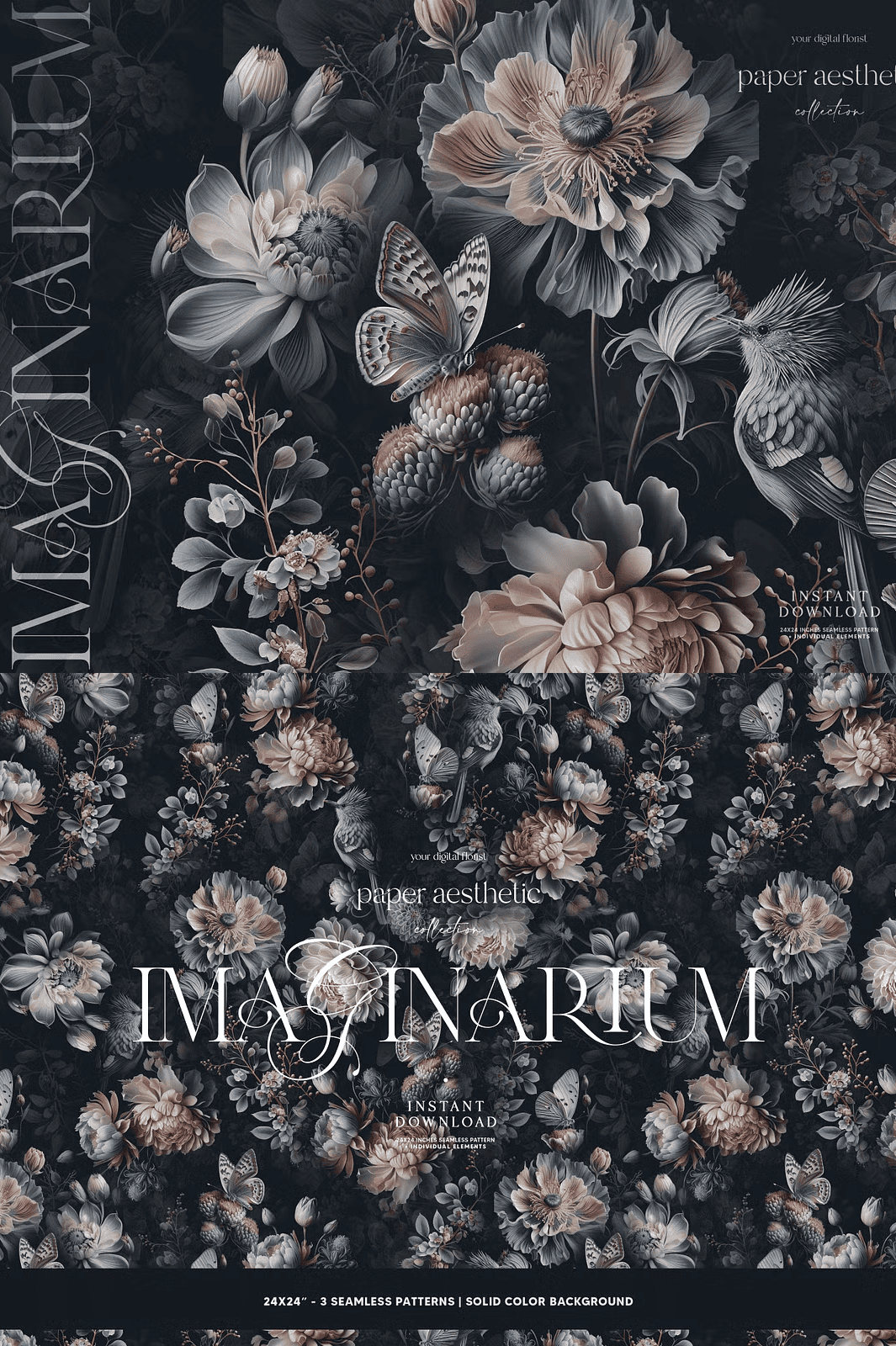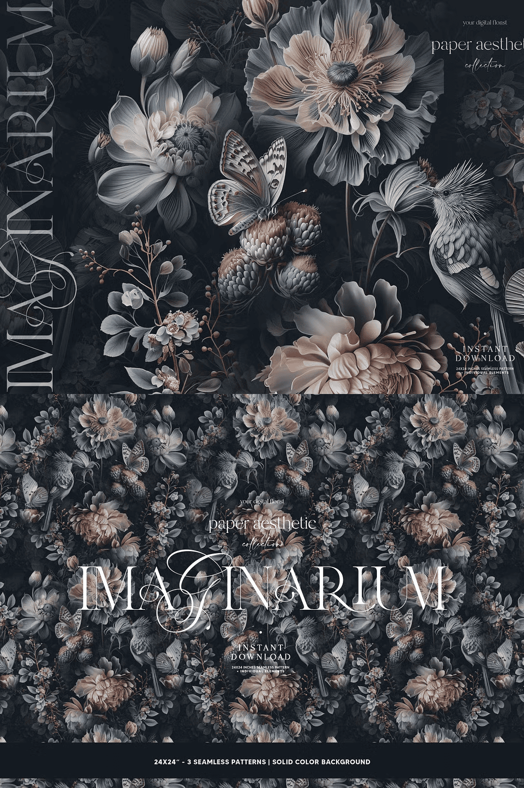 - Three seamless patterns – each 24 × 24 inches, set on a sleek dark background.