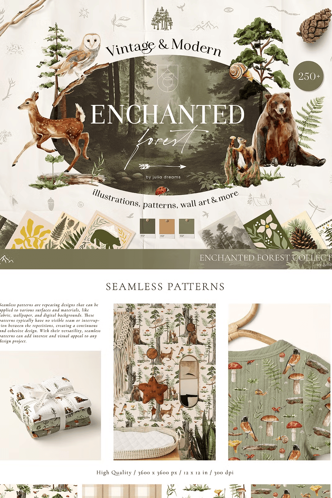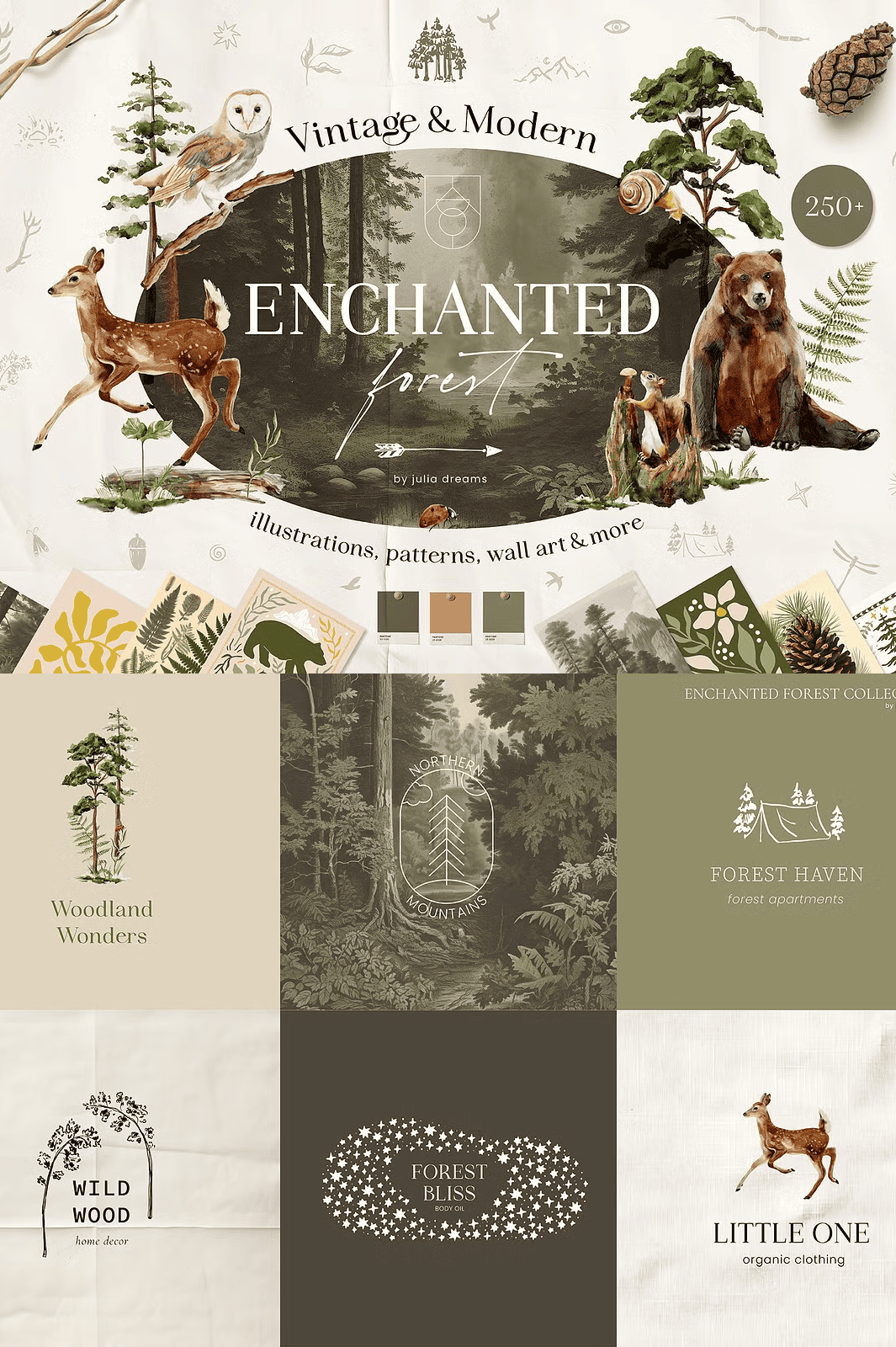 – **Packaging & Branding**: Use seamless patterns as wraps and forest creatures as logos or icons.