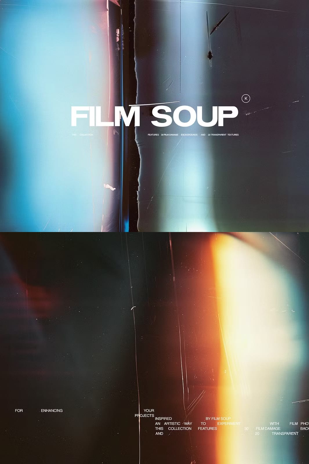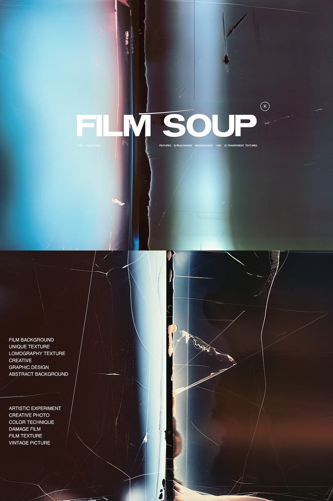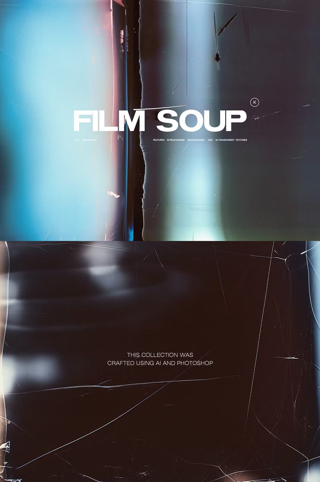 Film Soup is an innovative and captivating collection of 30 damaged film backgrounds and 20 transparent textures designed to elevate your creative projects. Inspired by the experimental art form of Film Soup photography, this collection was thoughtfully crafted using advanced AI techniques alongside traditional Photoshop methods to bring you truly unique visual assets. Whether you are working on digital art, websites, branding, or print media, these textures provide a rich vintage feel coupled with modern versatility.