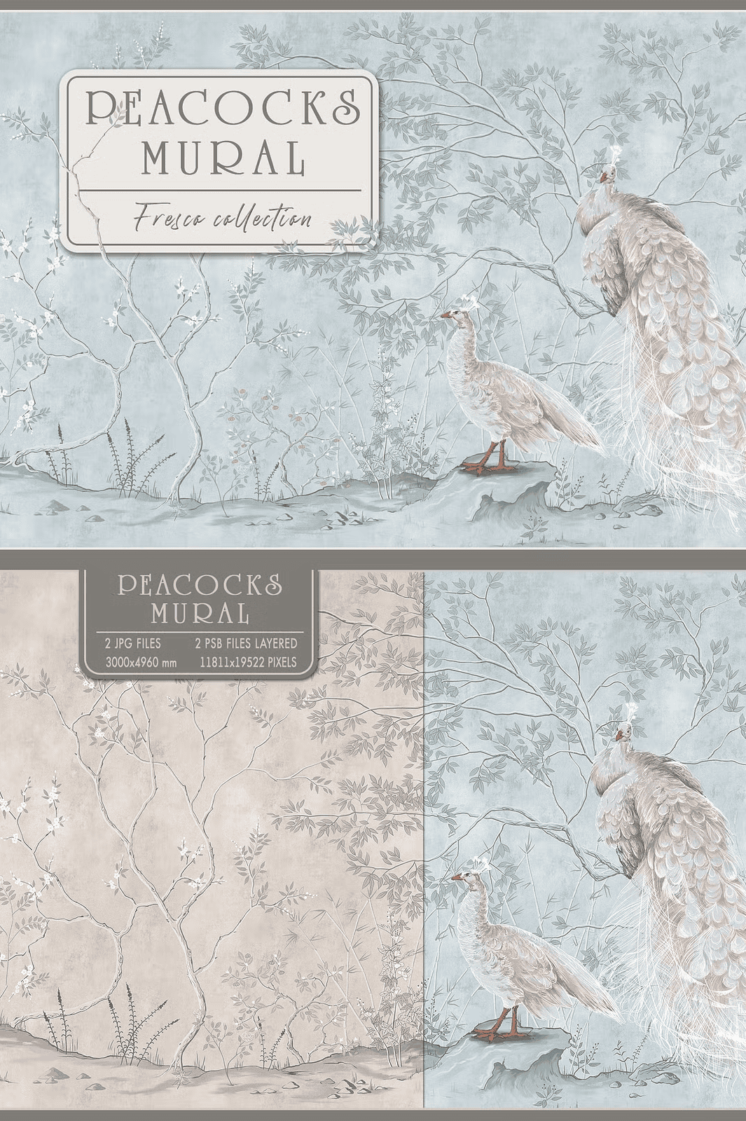 - 2 Layered PSB Files (23,622 × 11,811 pixels, 100 DPI): Full-resolution, editable mural-grade files for large-scale printing or wall installations. With layers intact, you can adjust colors, rearrange elements, and customize every detail with precision.