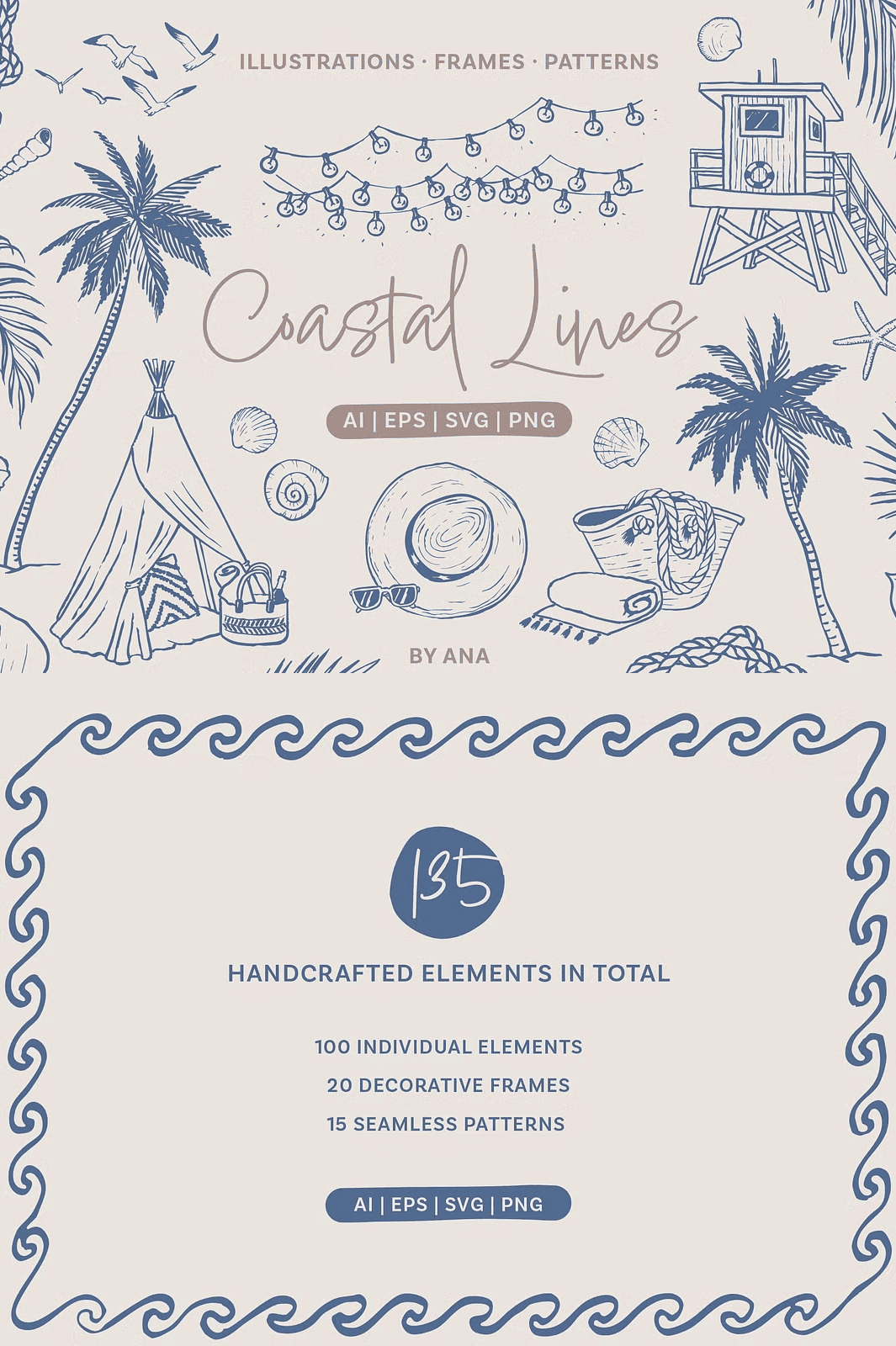 🎨 135 Unique Elements — From Individual Icons to Seamless Patterns