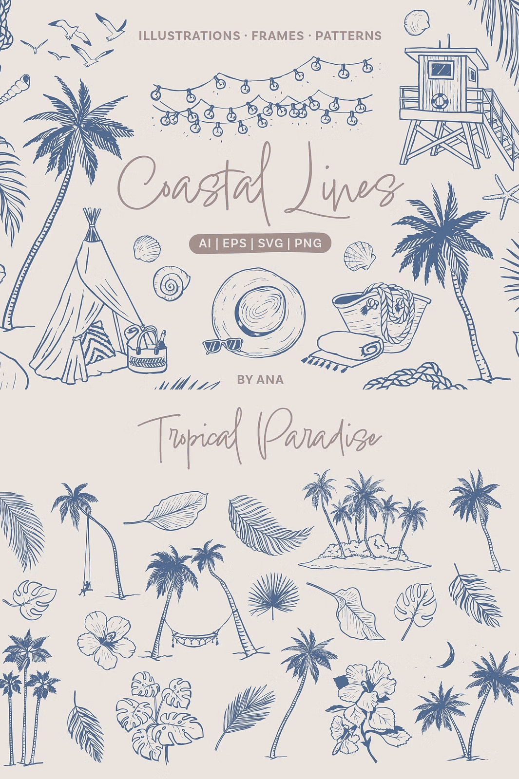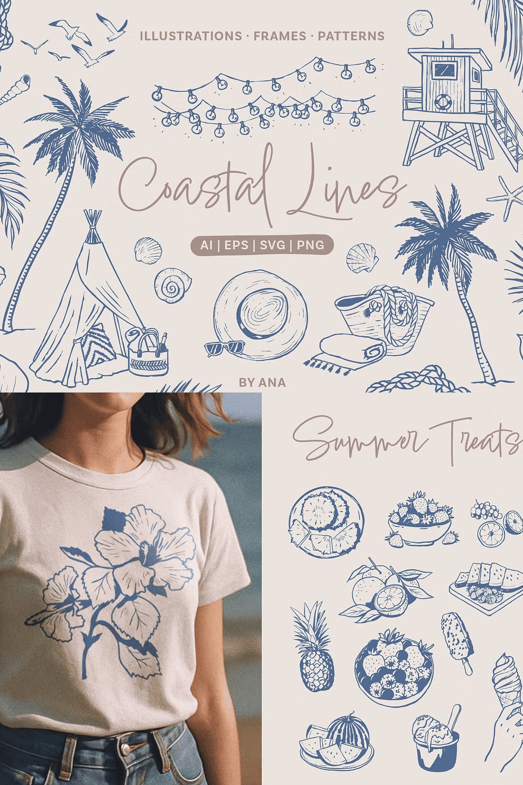 – **100 individual hand-drawn elements** featuring seashells, tropical fruits, palm trees, sun hats, surfboards, waves, and coastal wildlife