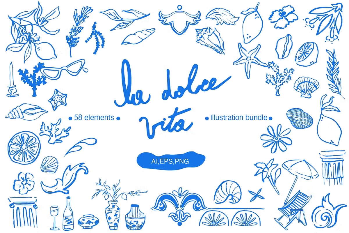 The La Dolce Vita Illustrations Pack is a vibrant, carefully crafted collection designed to inspire your next summer-themed projects. Featuring 46 hand-drawn objects inspired by the rich and lively spirit of Italian summers, this pack captures the essence of Mediterranean culture through its detailed artwork and diverse design elements. Whether you are creating for marketing, apparel, print, or digital applications, these illustrations add authentic warmth and a timeless charm to your creative work.