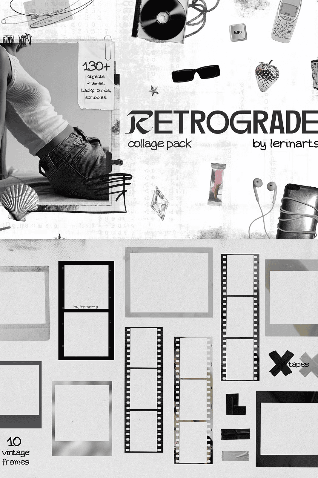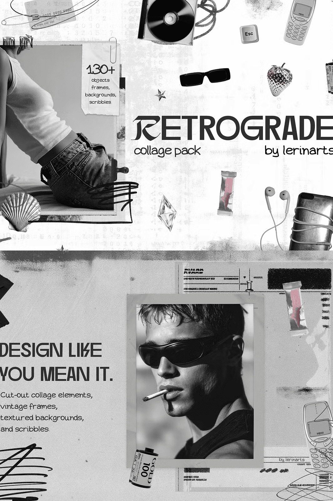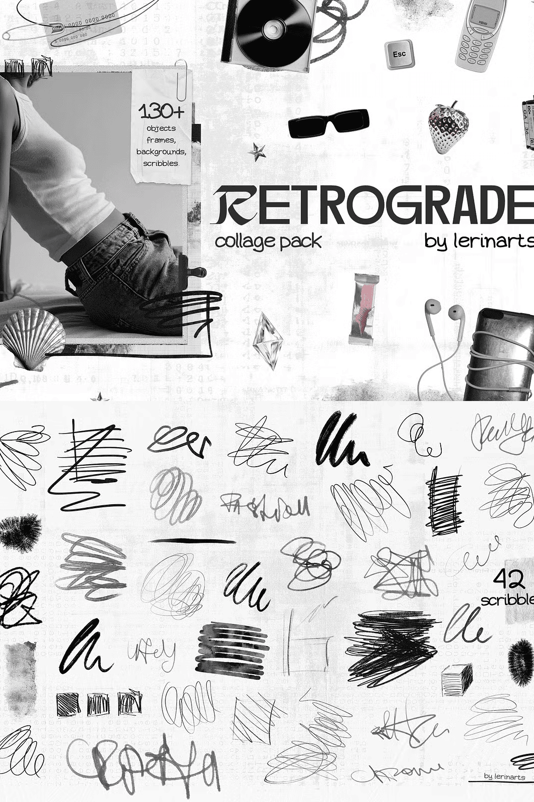 The RETROGRADE Collage Pack gives you everything you need to cut through the noise and make a statement. Stack layered textures, anchor your design with vintage frames, scatter scribbles for motion, and let the bold black-and-white palette do the rest. No extra tools. No complex workflows. Just raw visual power at your fingertips.