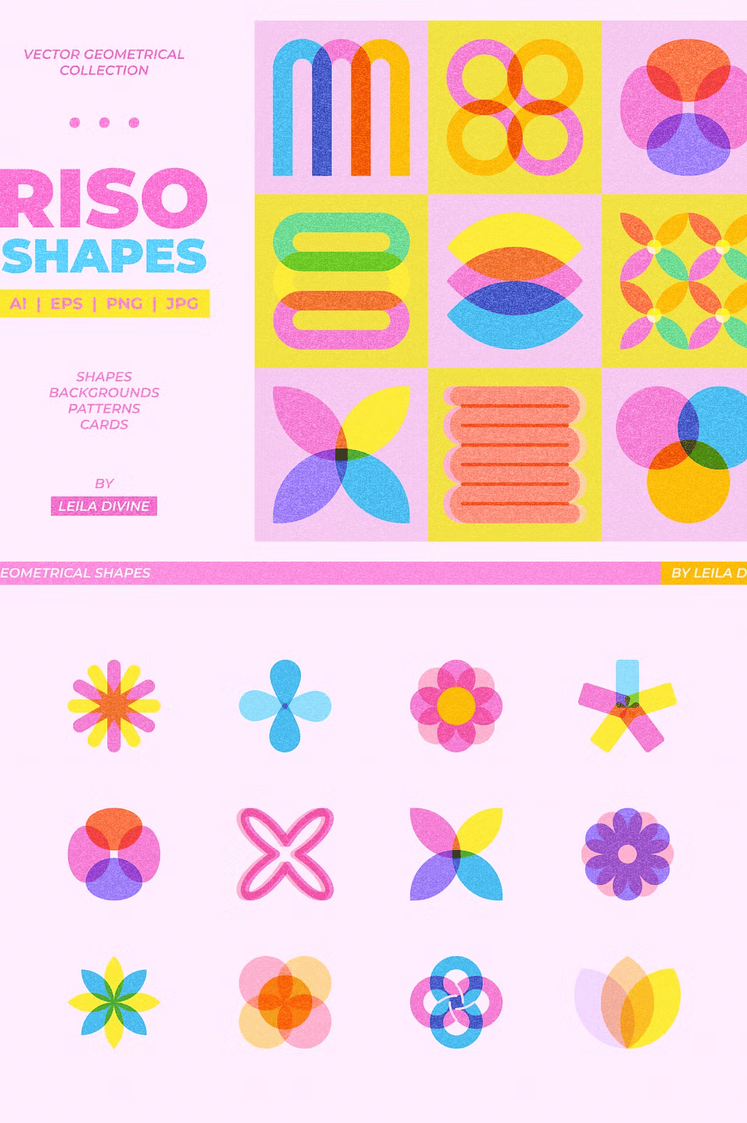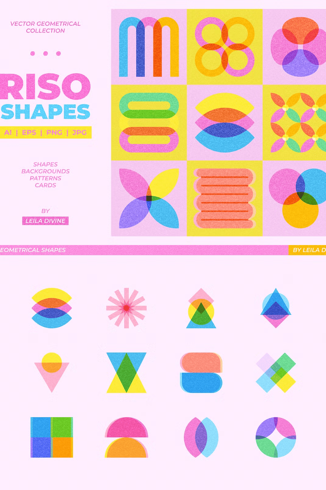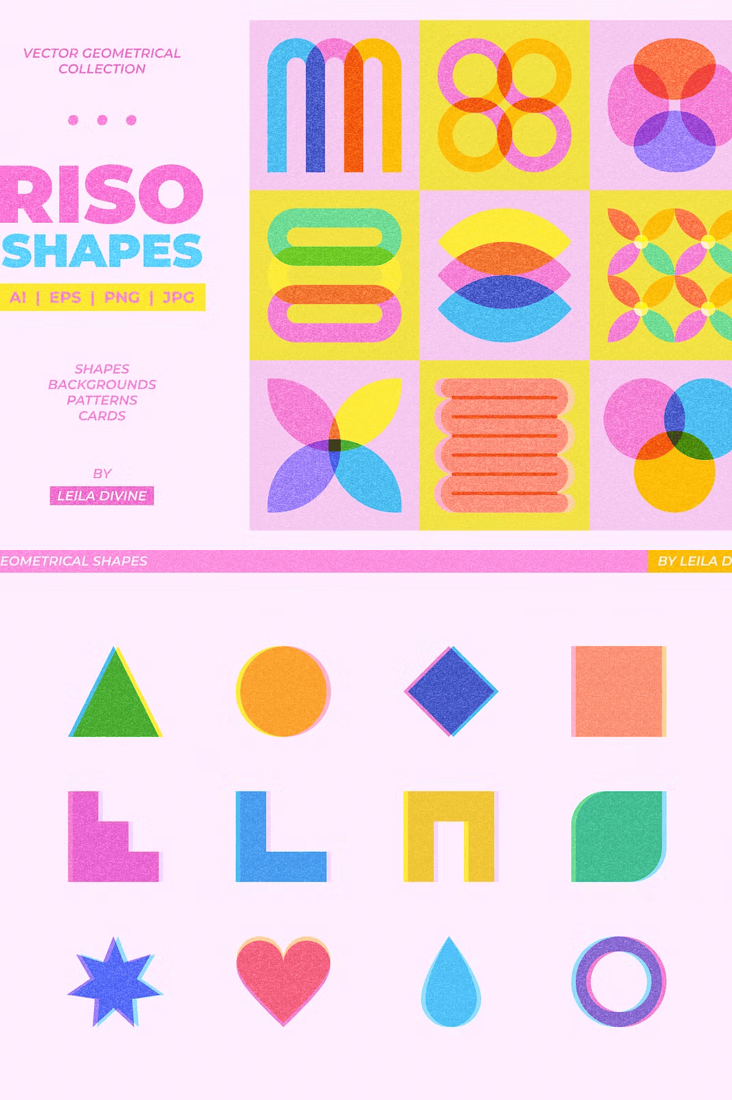 – **72 unique geometric shapes** with vector risograph textures (AI, EPS, PNG)