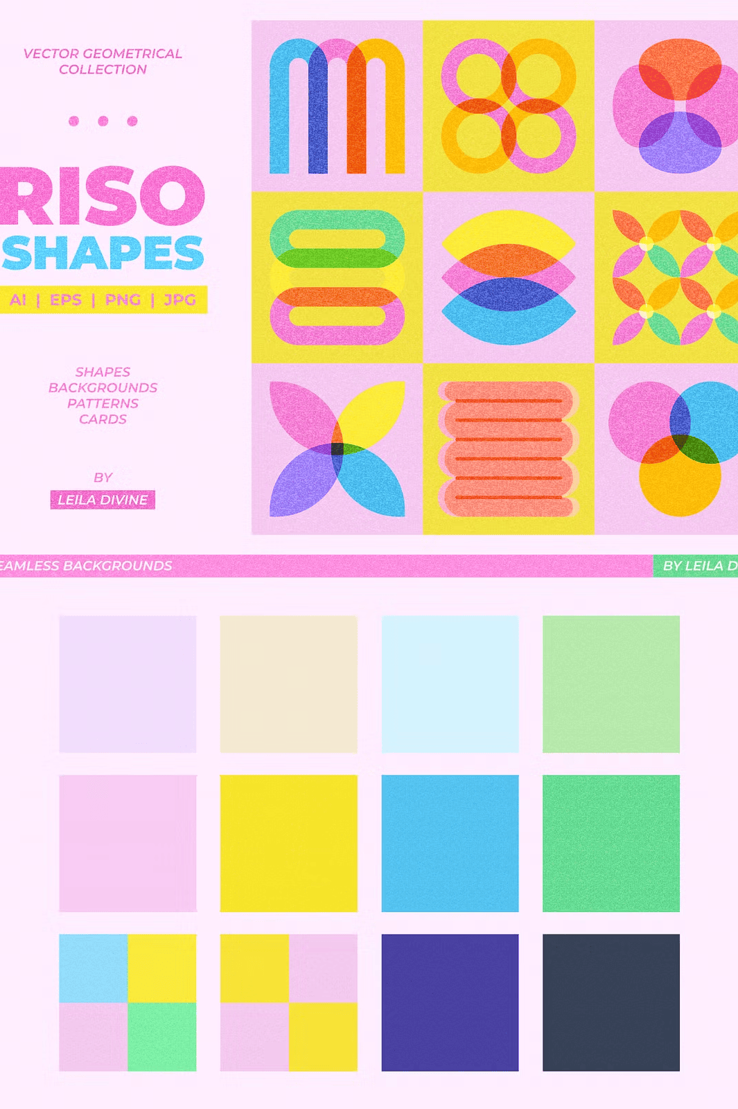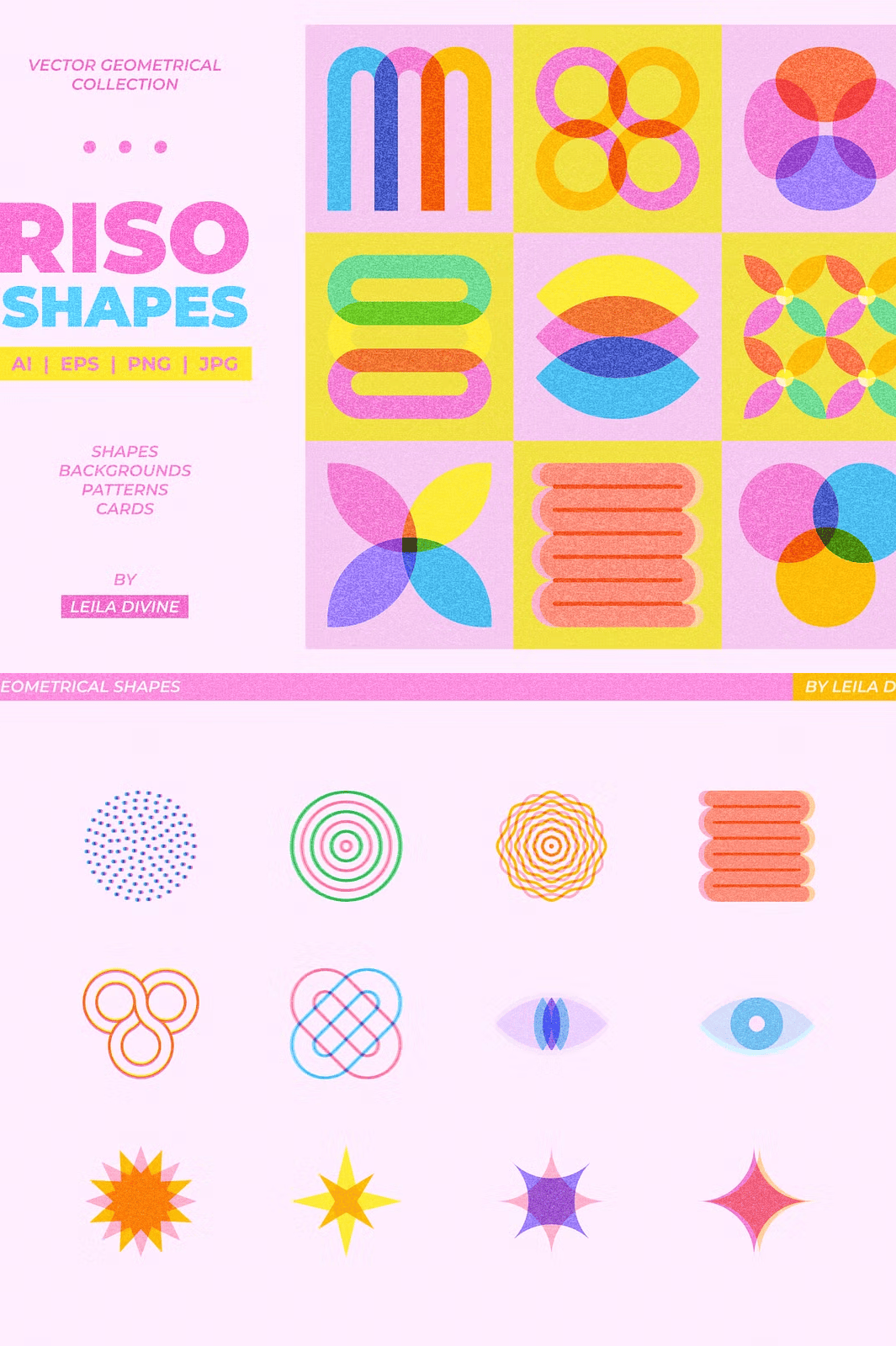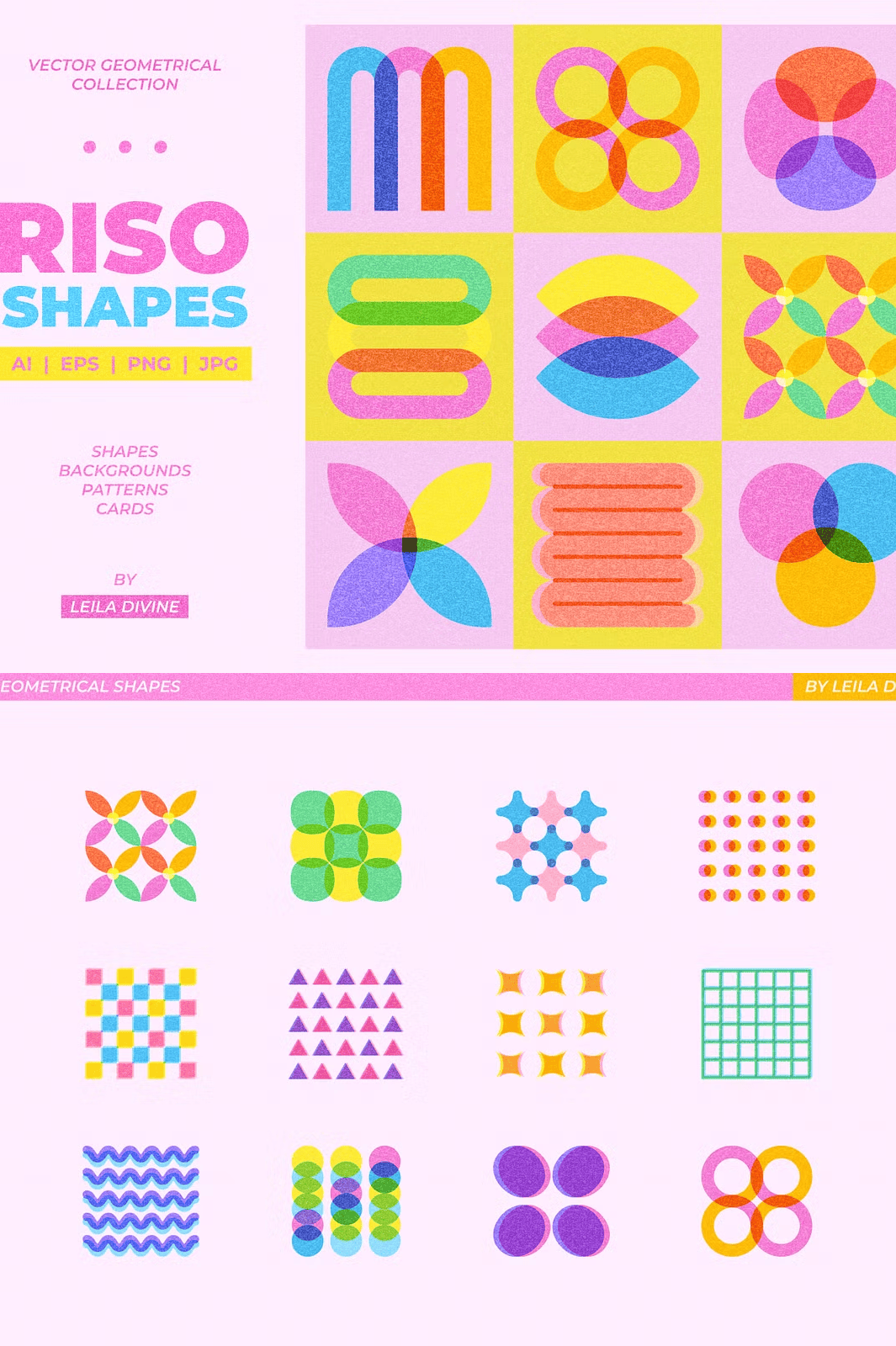 – **72 unique geometric shapes** with vector risograph textures (AI, EPS, PNG)