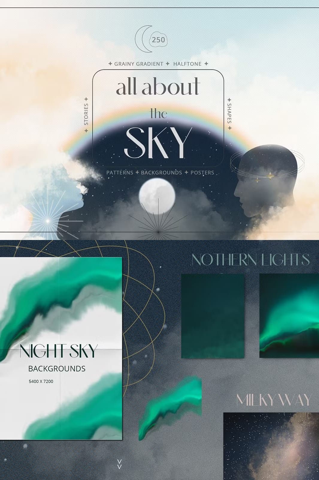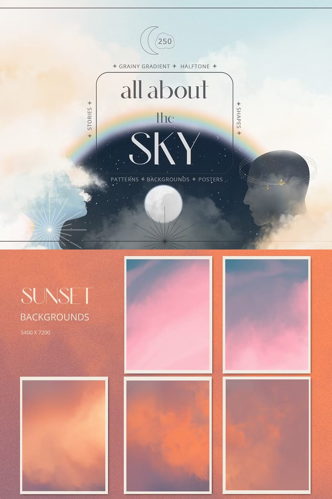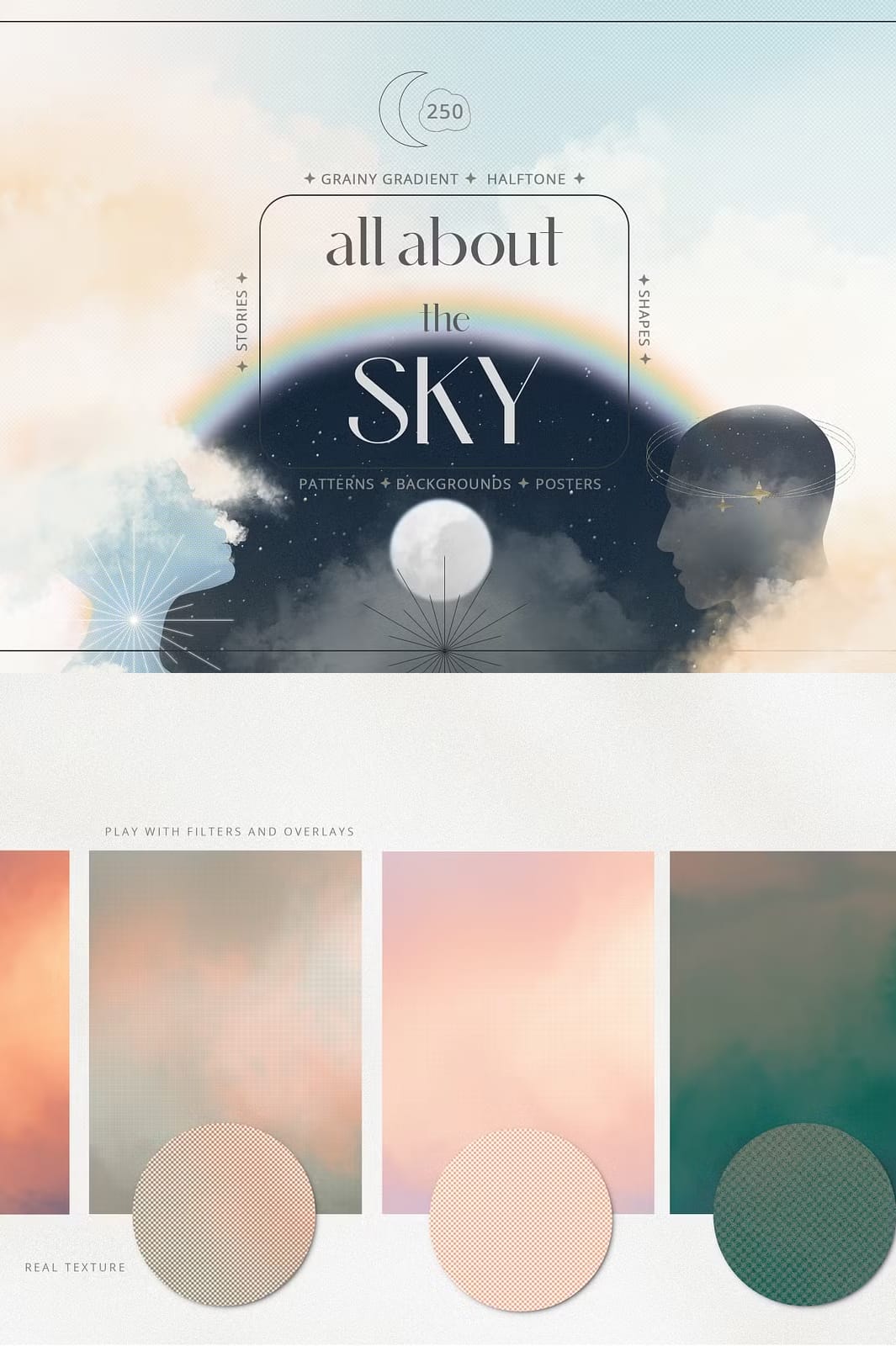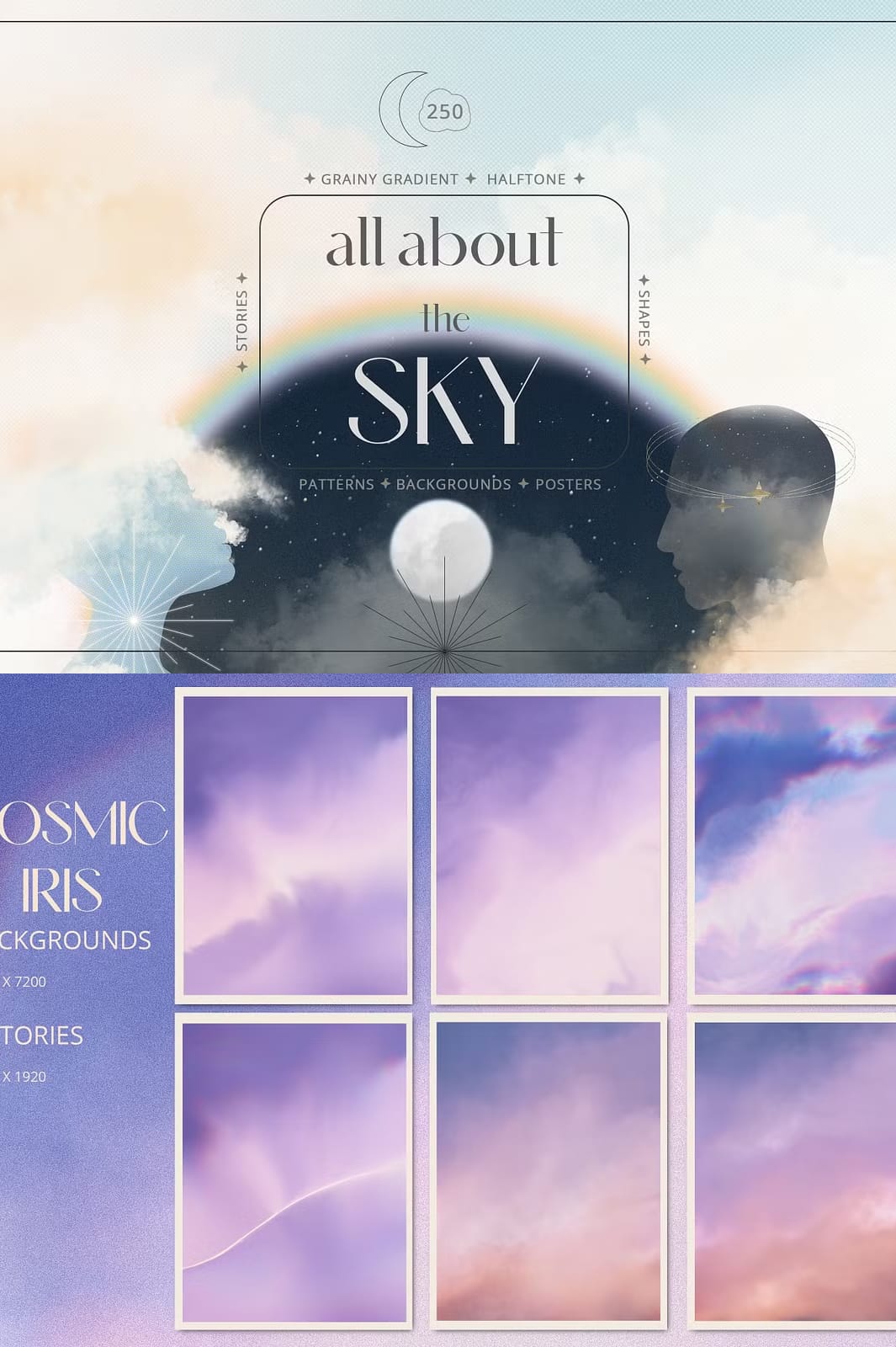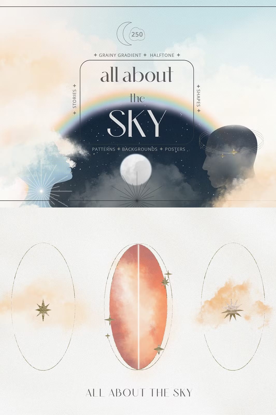 Welcome to the Sky Creator Collection, a captivating assortment of design elements that will transform your creative projects. This unique collection features an array of abstract shapes, grainy gradients, and celestial backgrounds that are perfect for both modern and psychedelic design aesthetics.