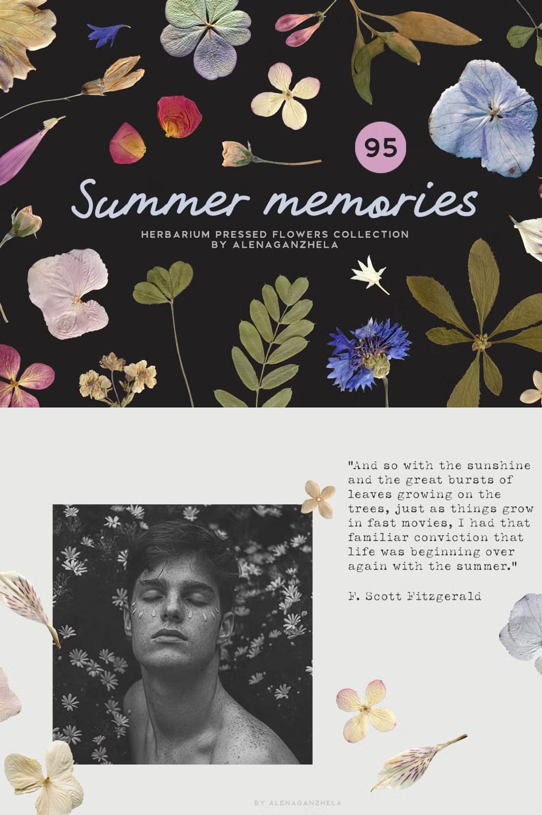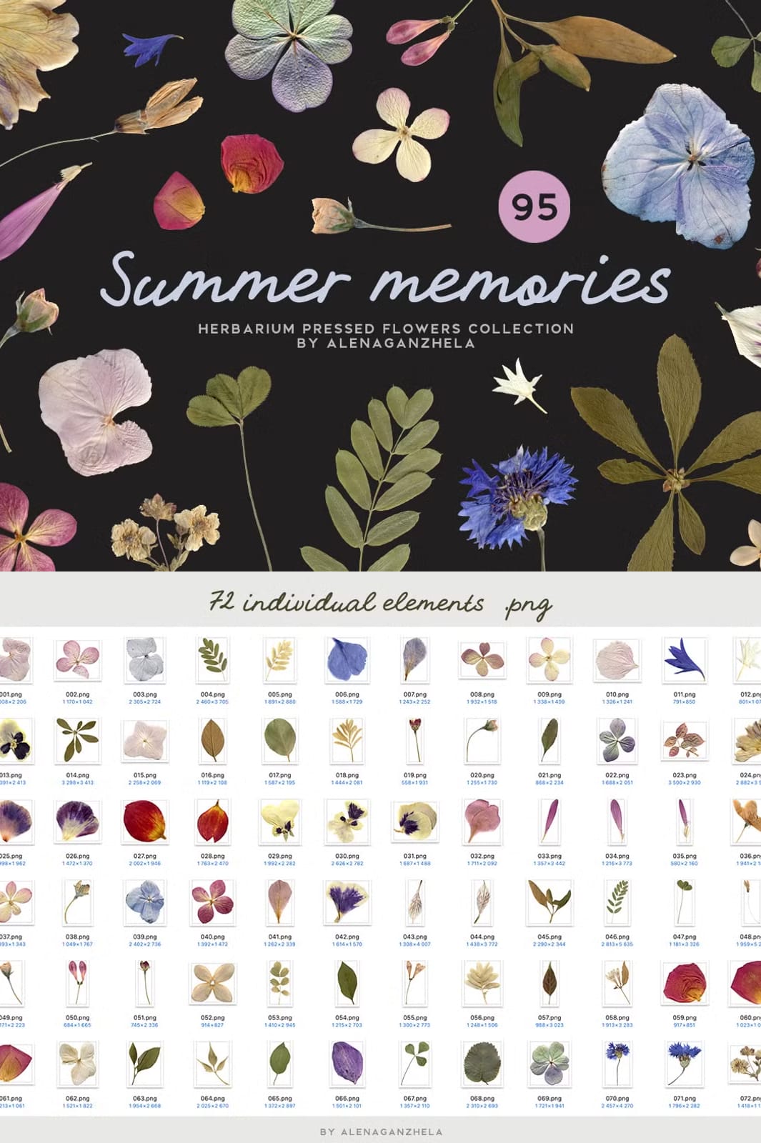 Introducing the SUMMER MEMORIES collection, a beautifully curated set of herbarium-pressed flowers and leaves that allows you to create distinctive and heartfelt designs. Each element in this collection has been carefully hand-picked and meticulously digitized to preserve the rich natural textures and intricate details of the plants. This exclusive offering invites you to add a touch of timeless elegance and romance to your creative projects.