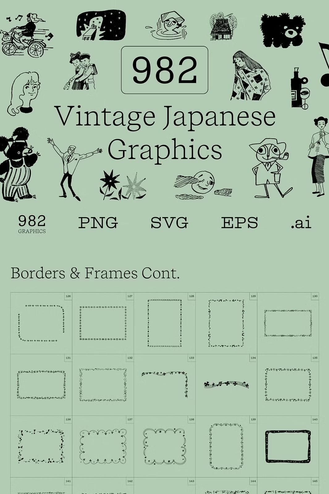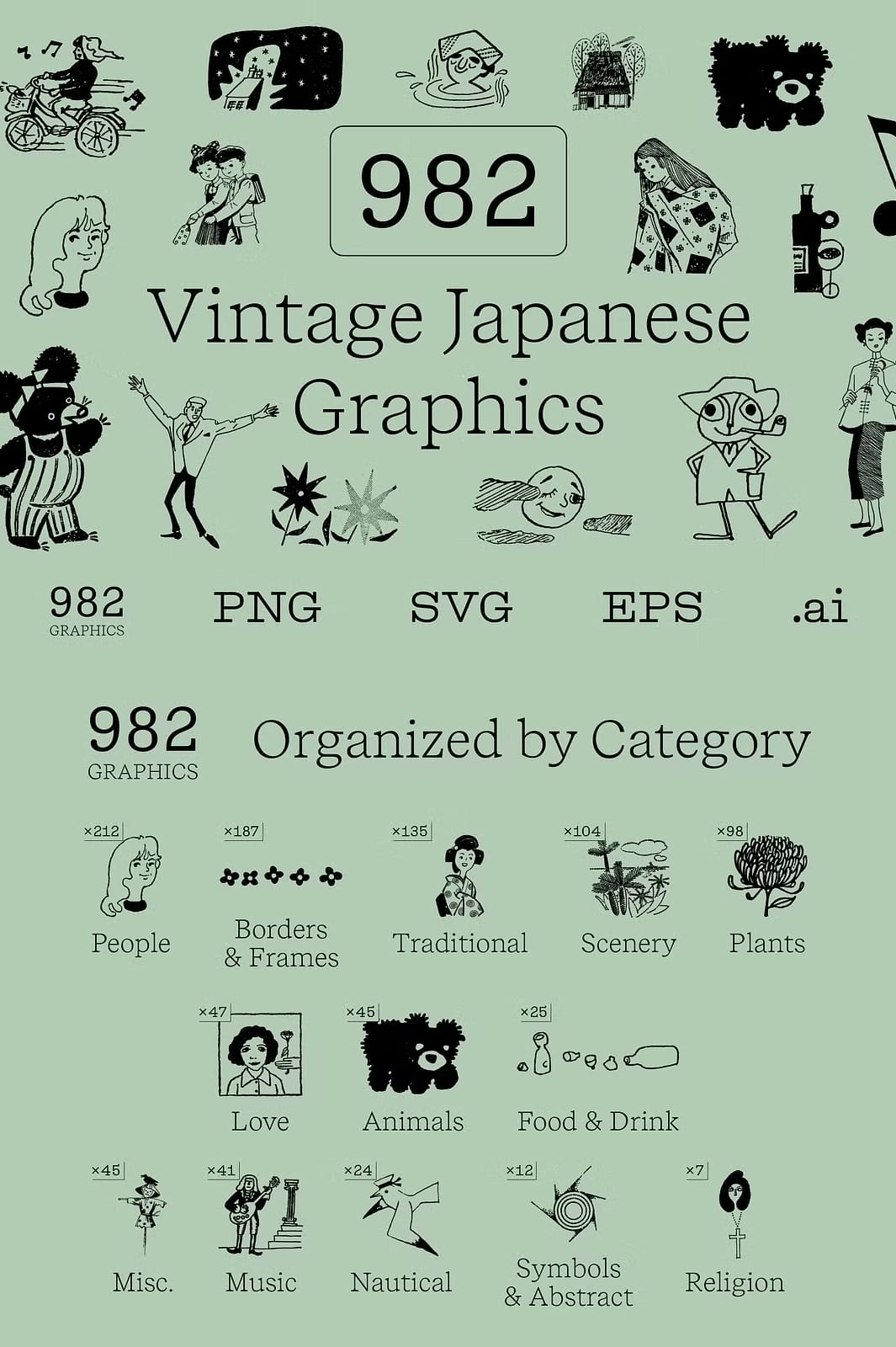This monumental bundle includes a total of 982 high-quality graphics, each crafted at 300 dpi with transparent backgrounds to provide ultimate flexibility and creative freedom. The graphics represent a wide range of subjects centered around traditional Japanese culture, people, and ornamental borders and frames, with various other unique categories included as well.