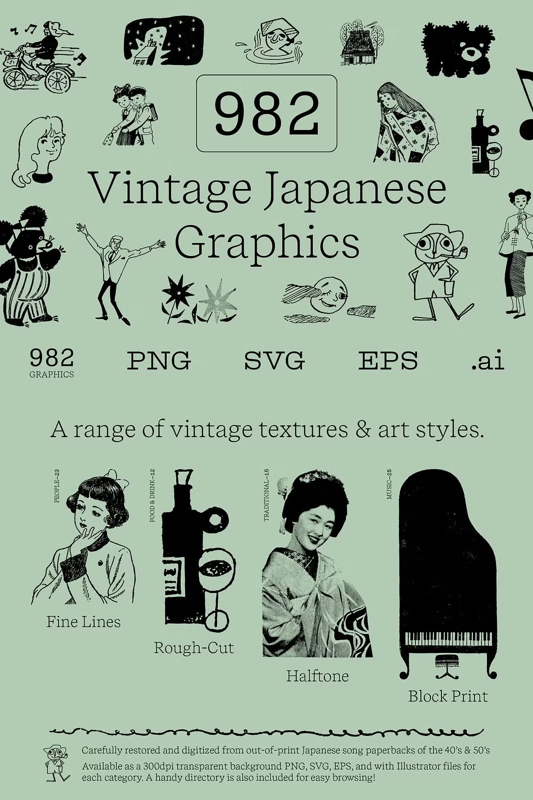 Immerse yourself in a vast collection of historic Japanese art with this incredible Vintage Japanese Graphics Bundle that offers a unique glimpse into the rich cultural and artistic heritage of Japan from the 1940s and 1950s. Carefully restored and digitally enhanced, these graphics bring to life the authentic charm of classic Japanese song paperbacks, now freshly available on the internet for your creative projects.