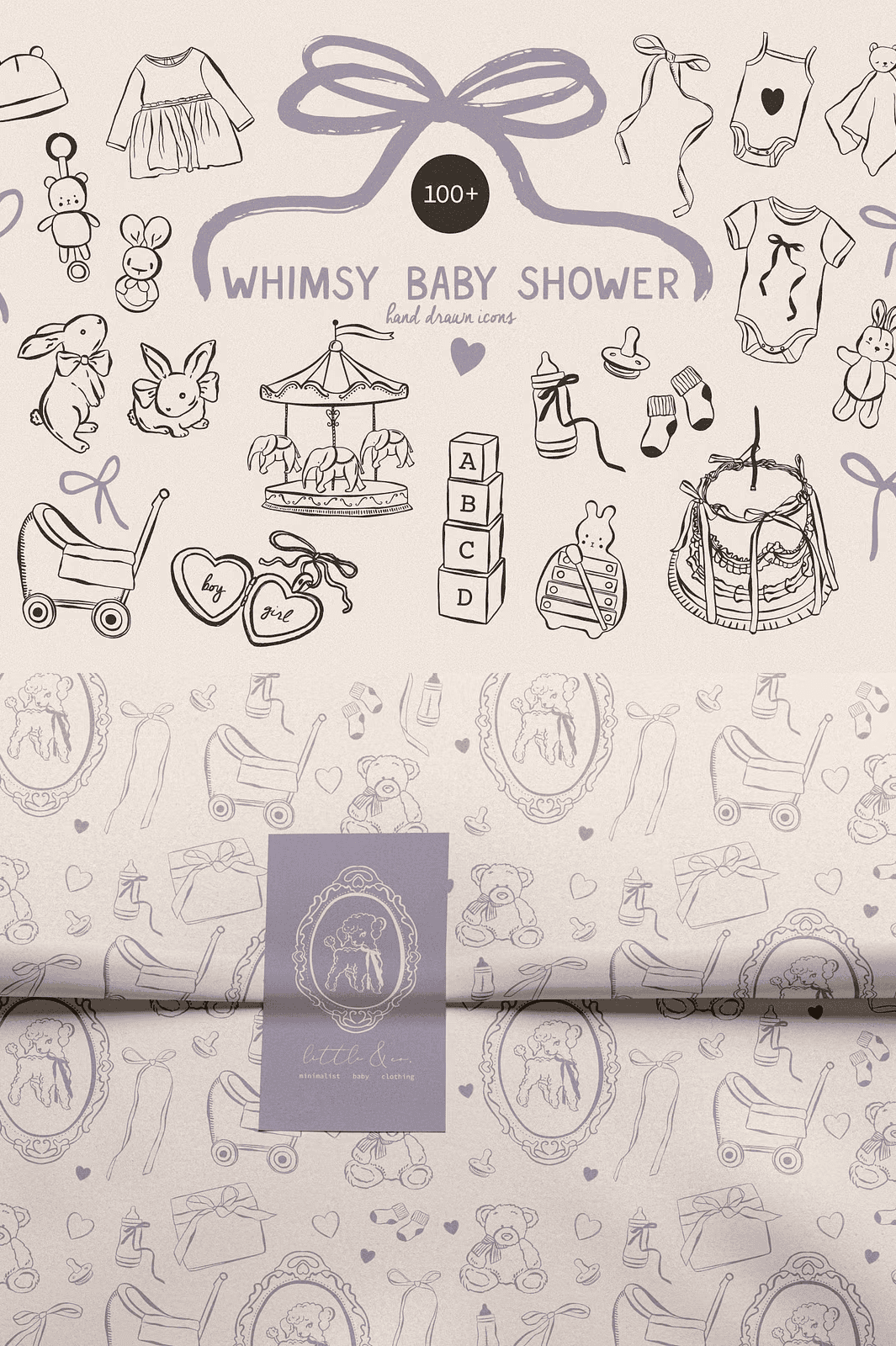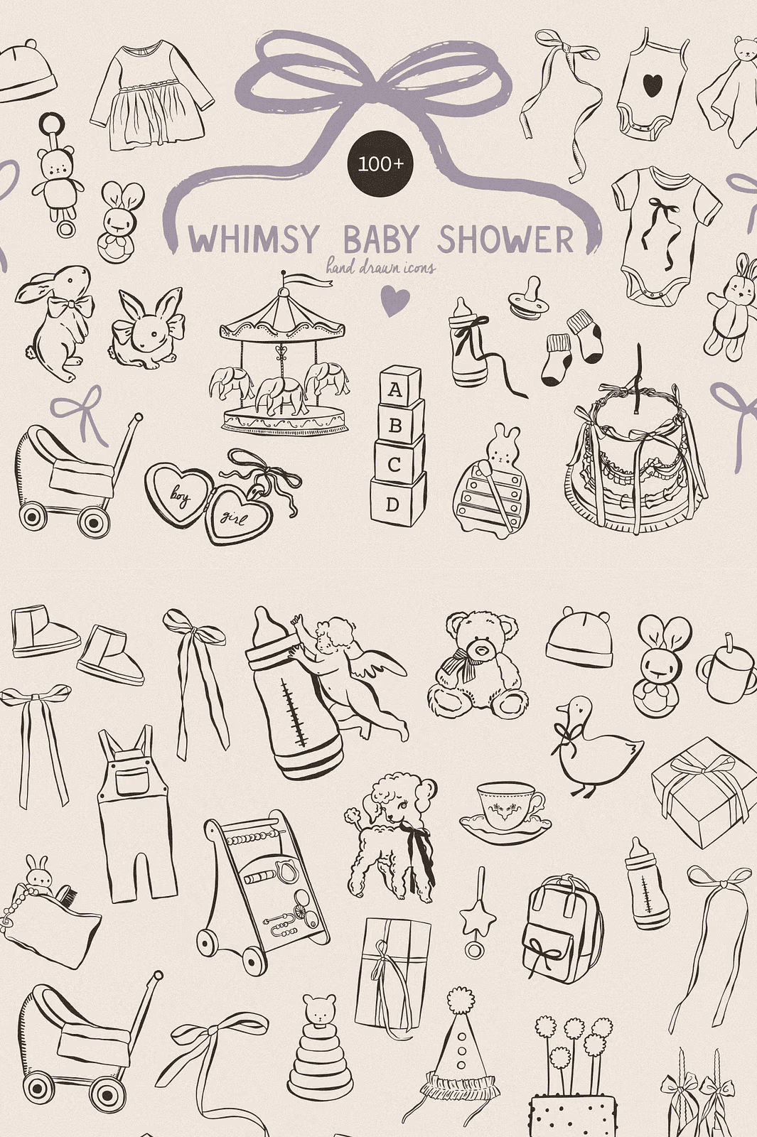 — Simple, expressive line drawings of baby-themed icons: rattles, booties, stars, onesies, bottles, animals, and hearts.