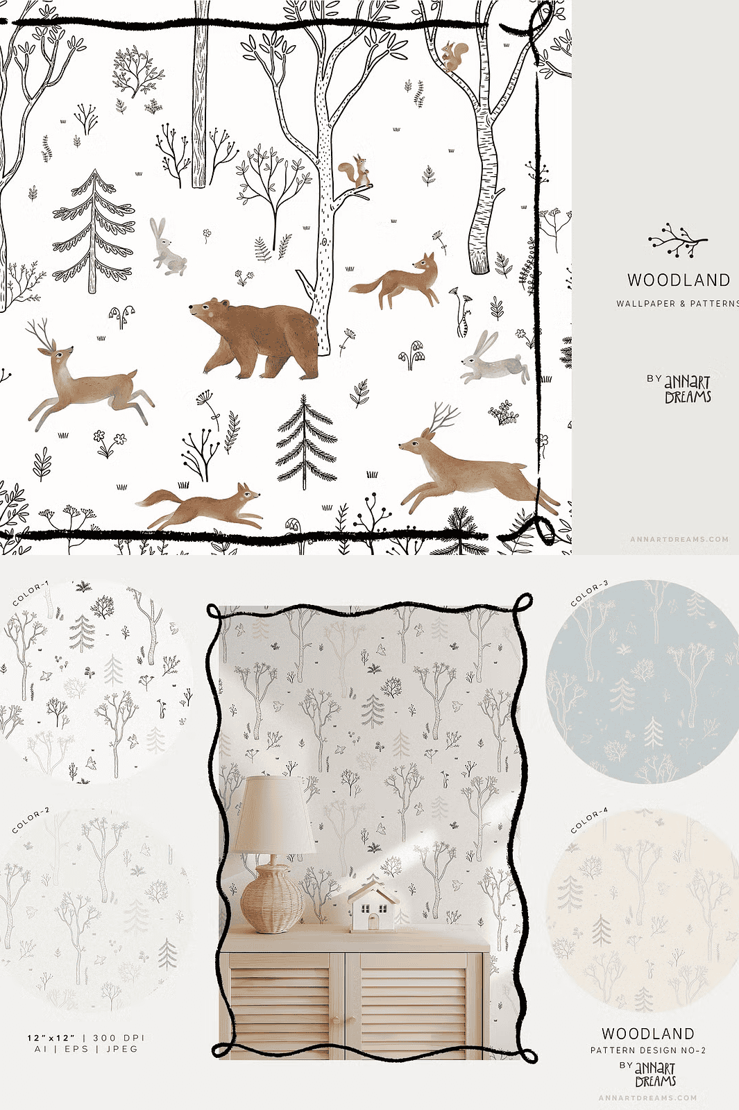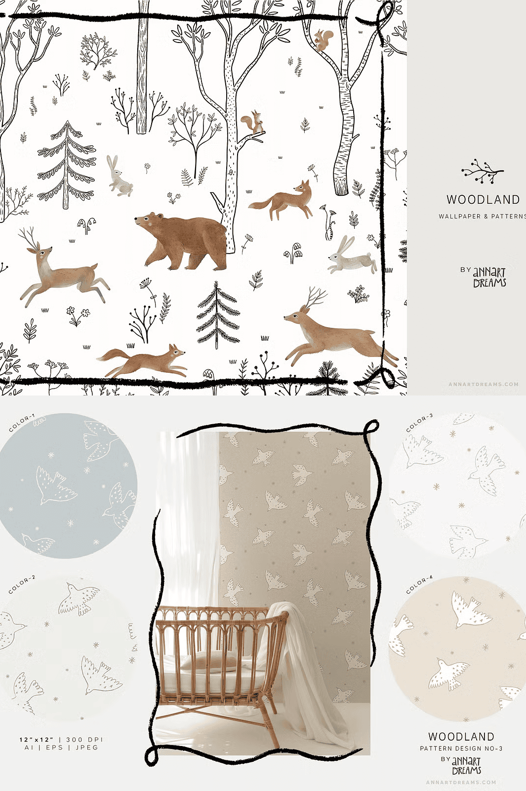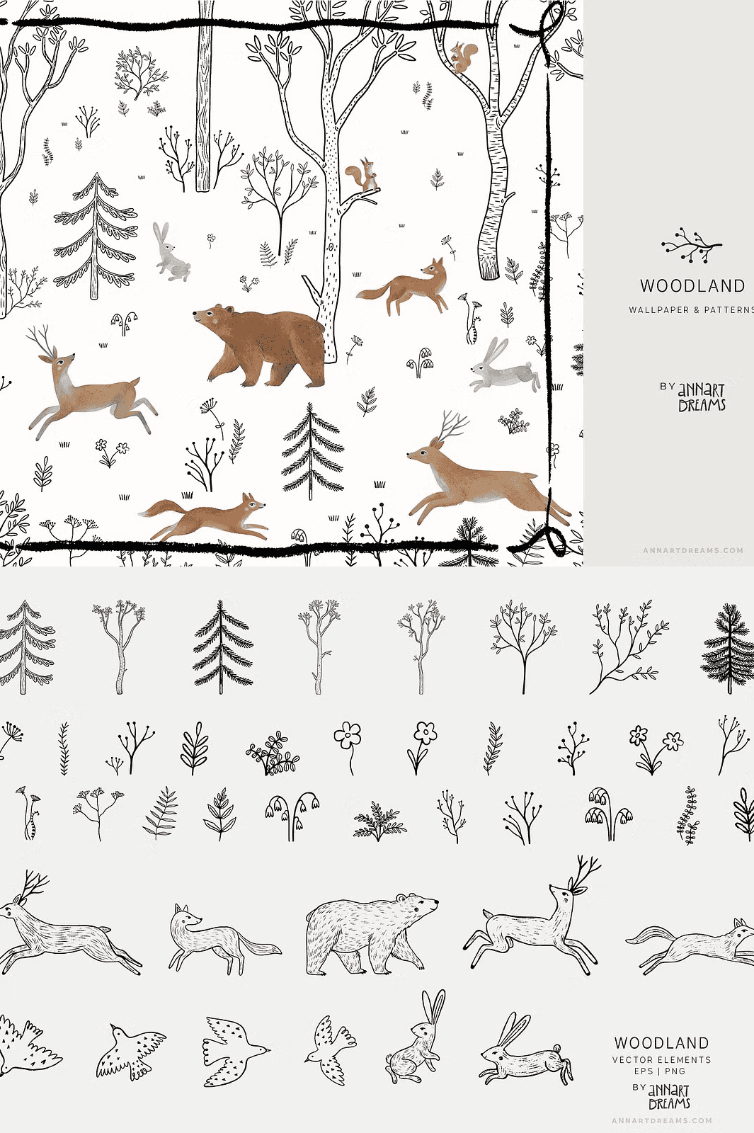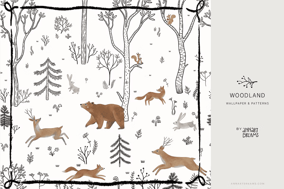 Step into a serene forest sanctuary with the **WOODLAND Wall Mural and Patterns Collection** – a meticulously crafted creative bundle that blends the raw elegance of black-and-white line art with the soft beauty of watercolor textures. This collection captures the quiet magic of nature through intricate compositions featuring forest dwellers like deer, bears, hares, squirrels, and foxes. Each piece is designed to inspire wonder and calm, making it the perfect choice for transforming children’s rooms, playspaces, or any interior with a natural, storytelling atmosphere.