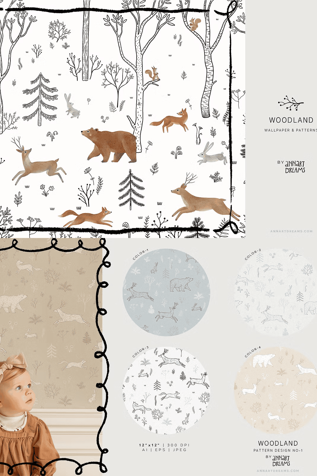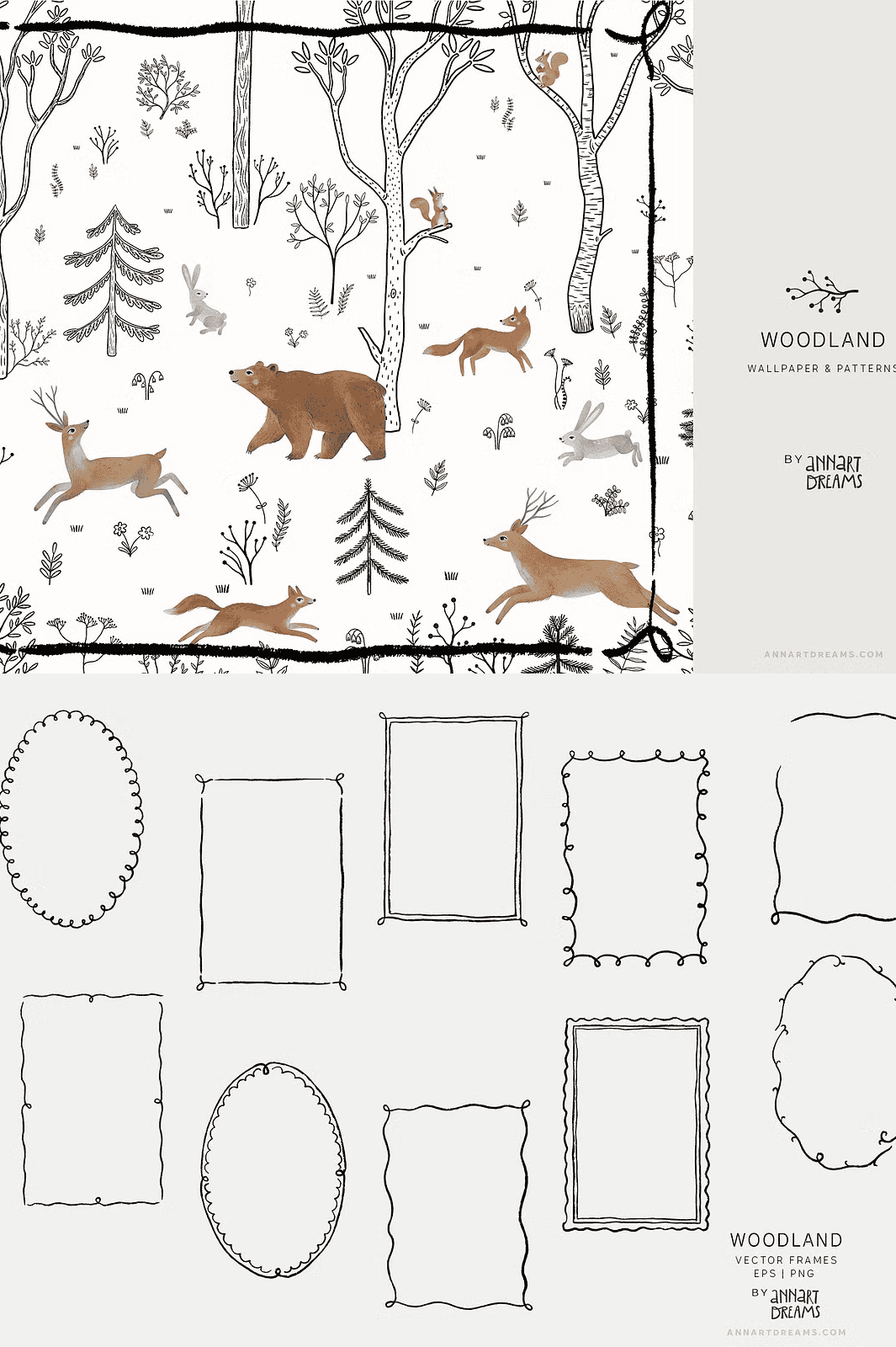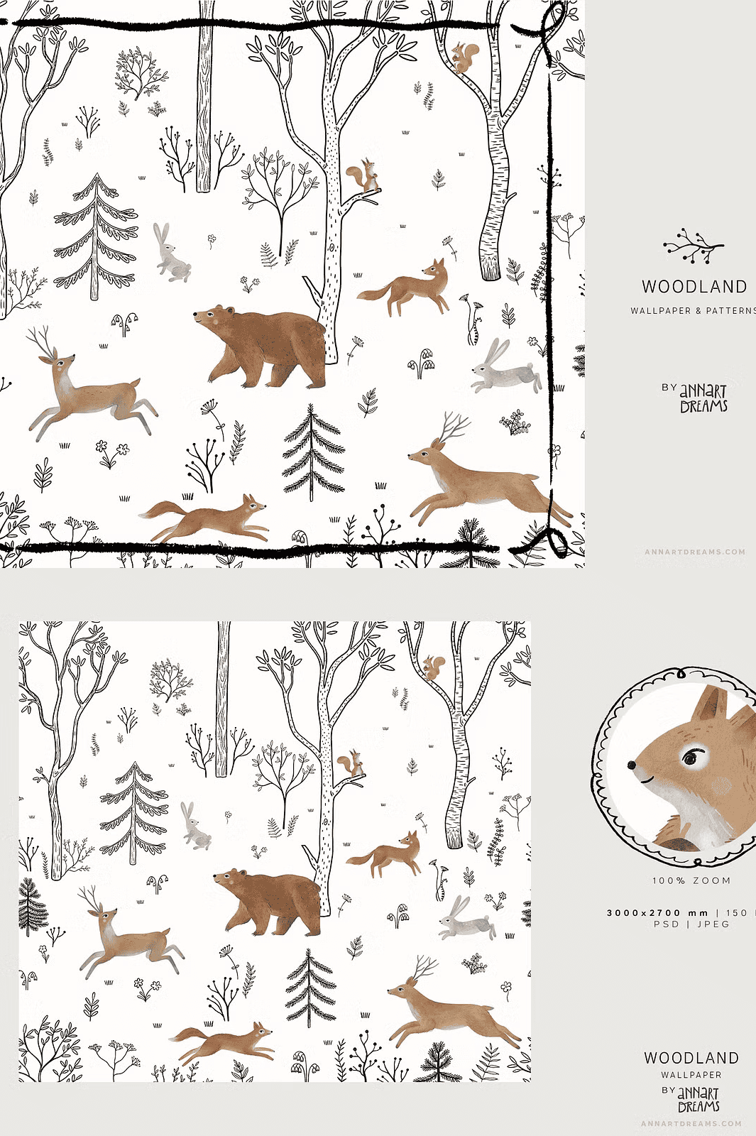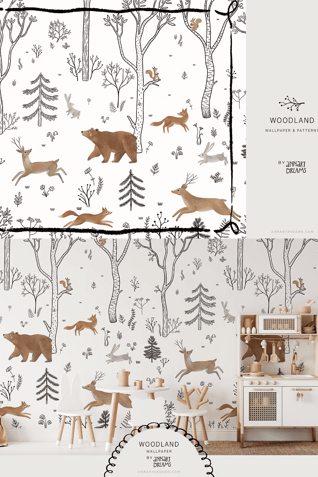 Step into a serene forest sanctuary with the **WOODLAND Wall Mural and Patterns Collection** – a meticulously crafted creative bundle that blends the raw elegance of black-and-white line art with the soft beauty of watercolor textures. This collection captures the quiet magic of nature through intricate compositions featuring forest dwellers like deer, bears, hares, squirrels, and foxes. Each piece is designed to inspire wonder and calm, making it the perfect choice for transforming children’s rooms, playspaces, or any interior with a natural, storytelling atmosphere.